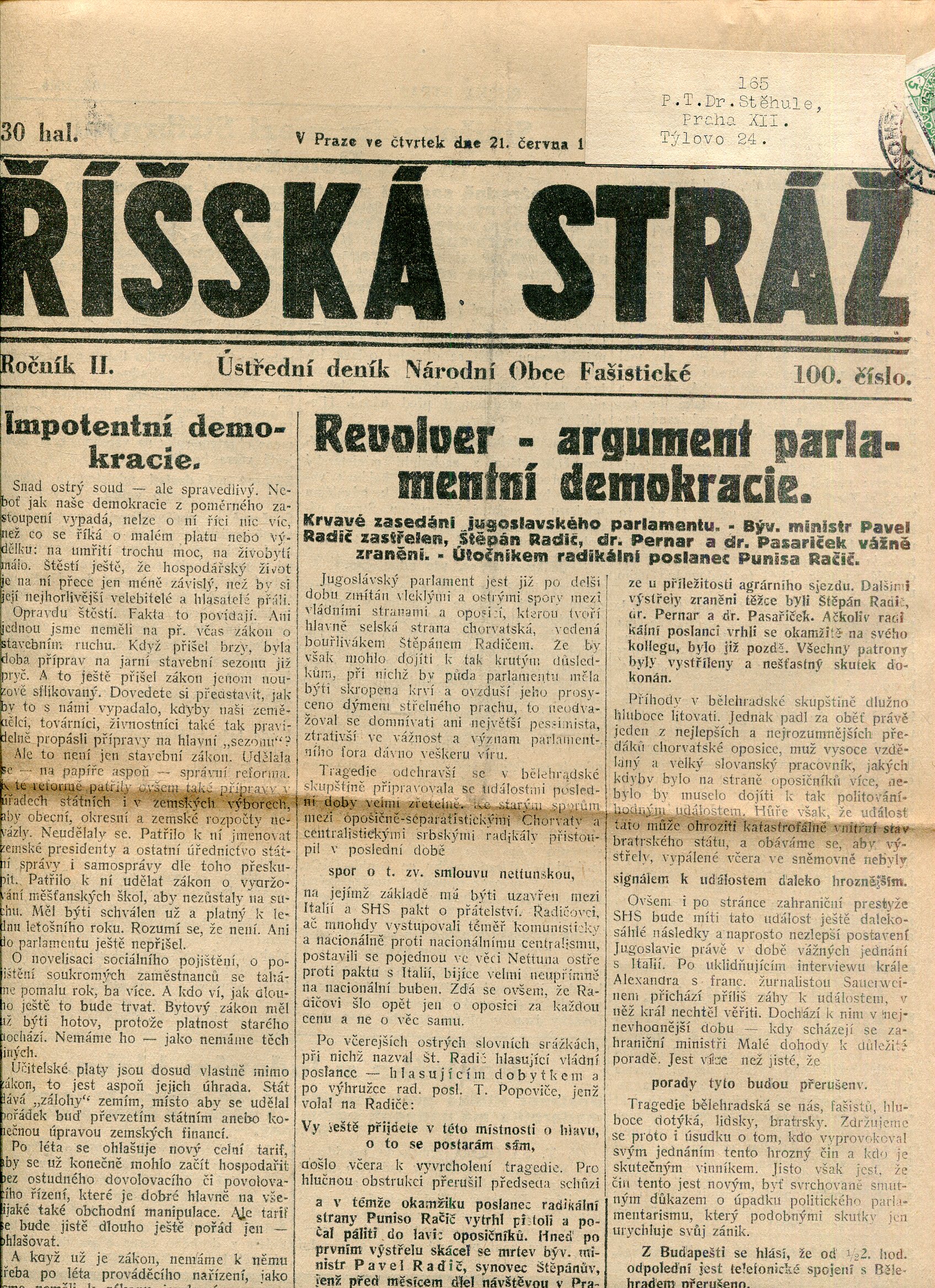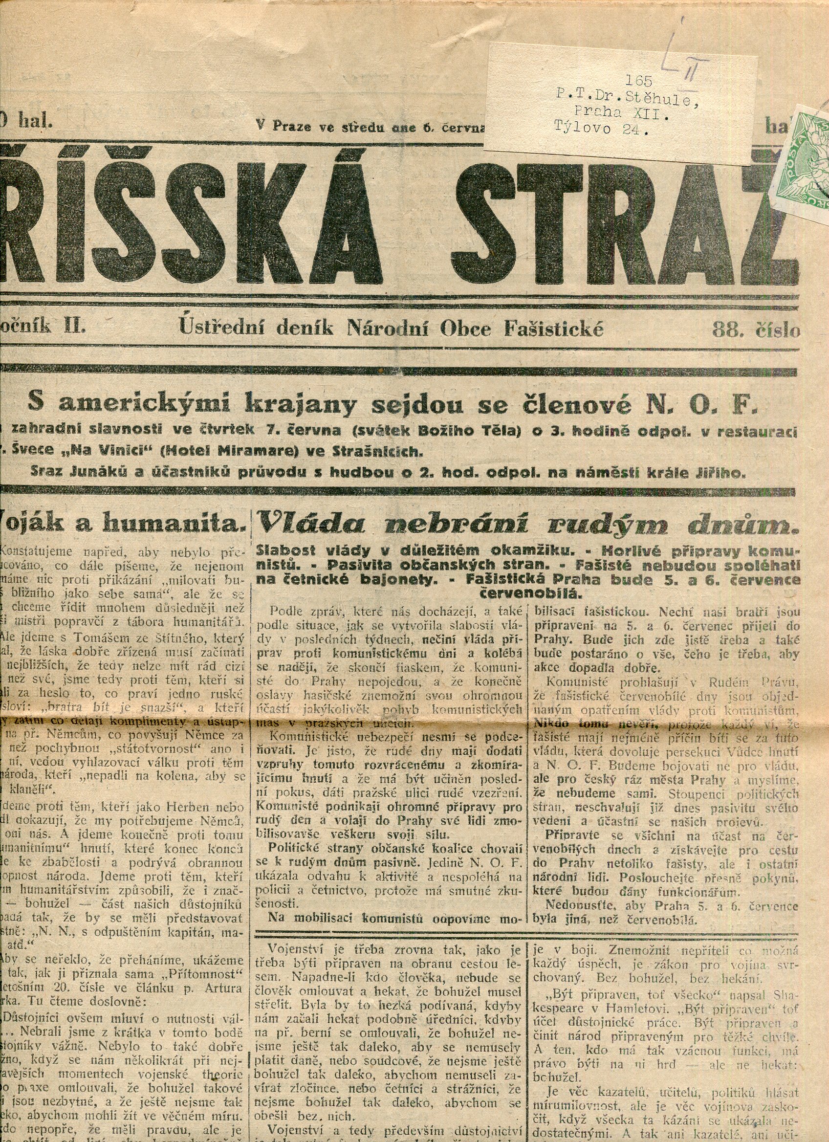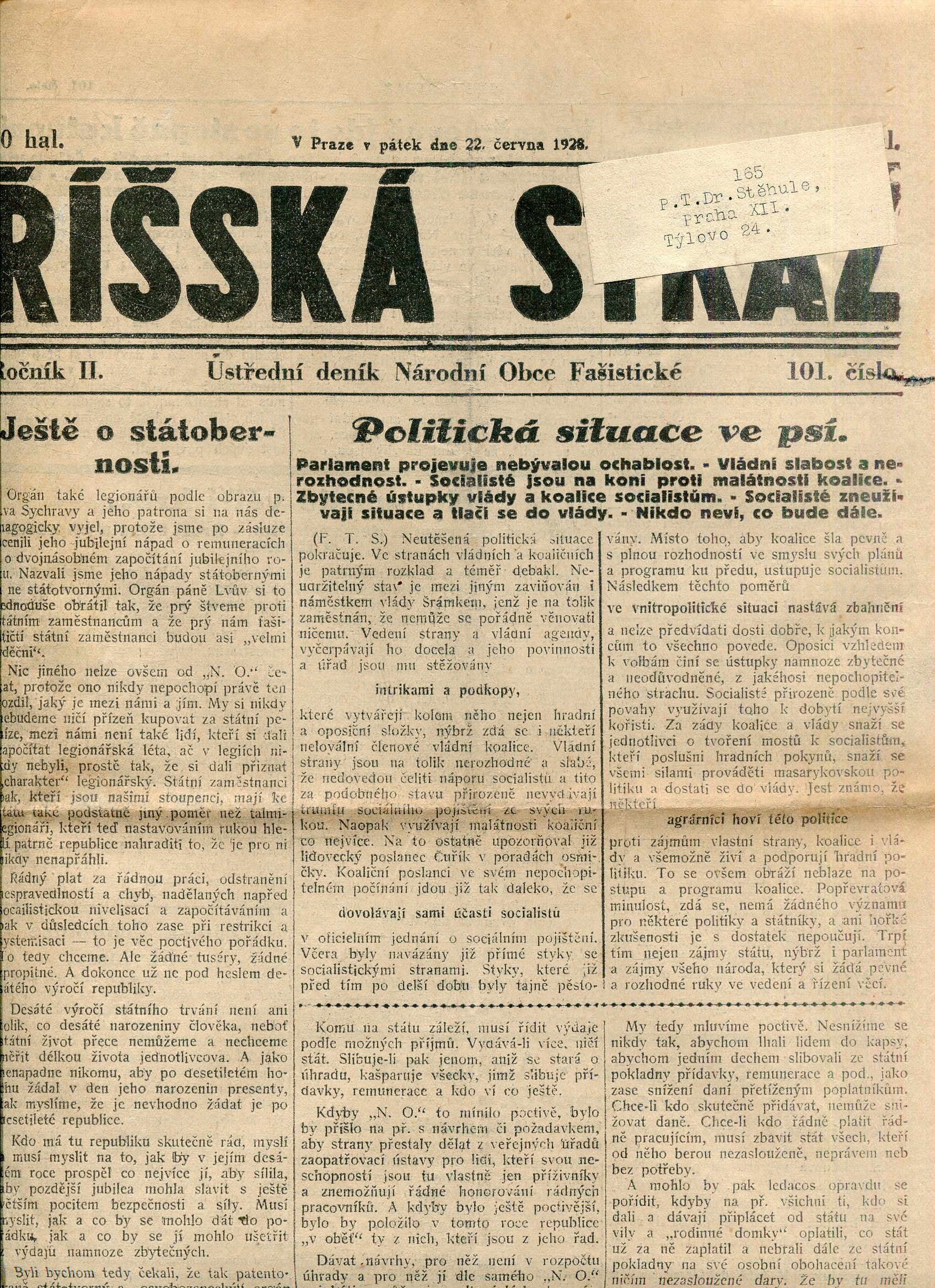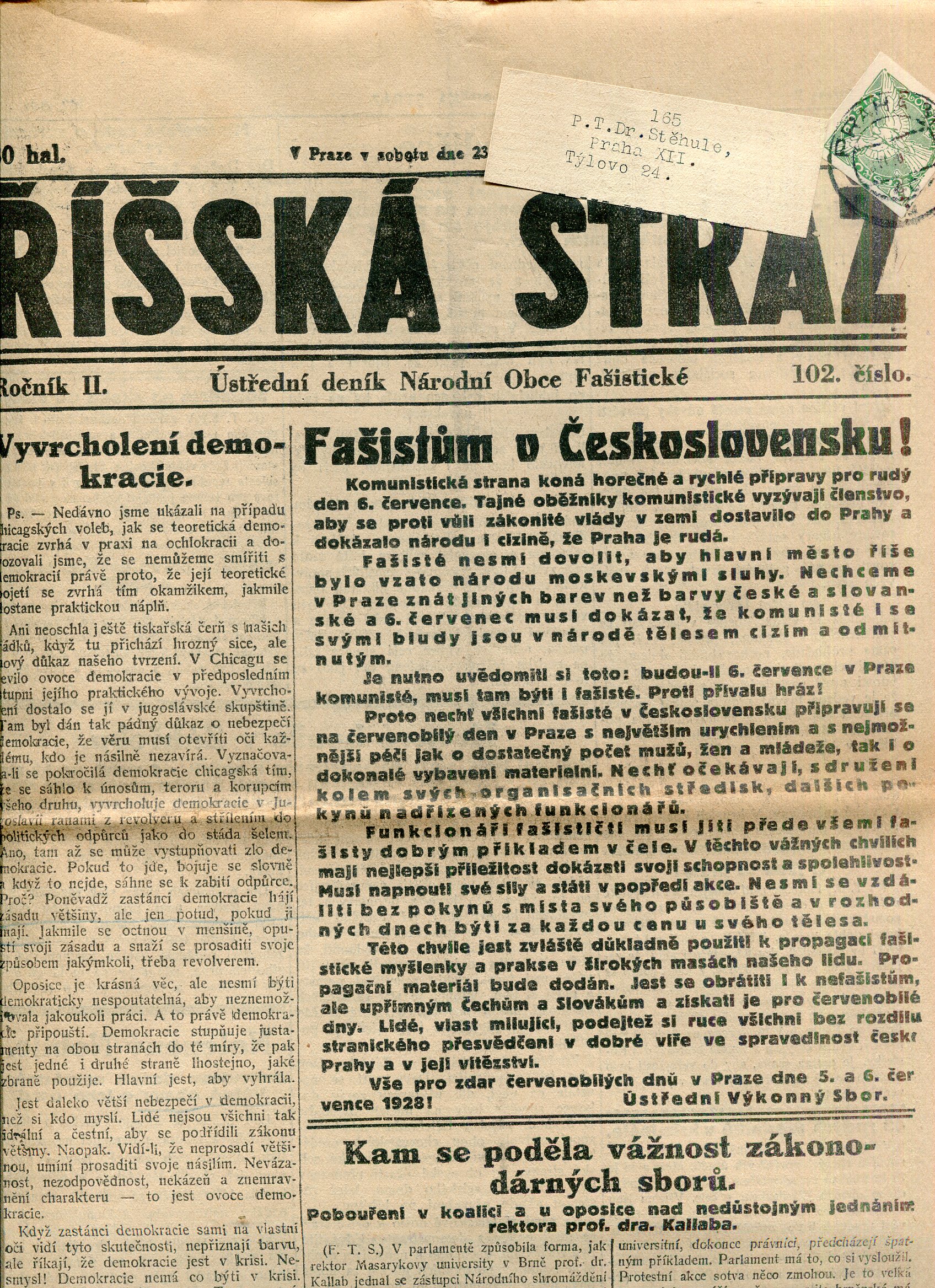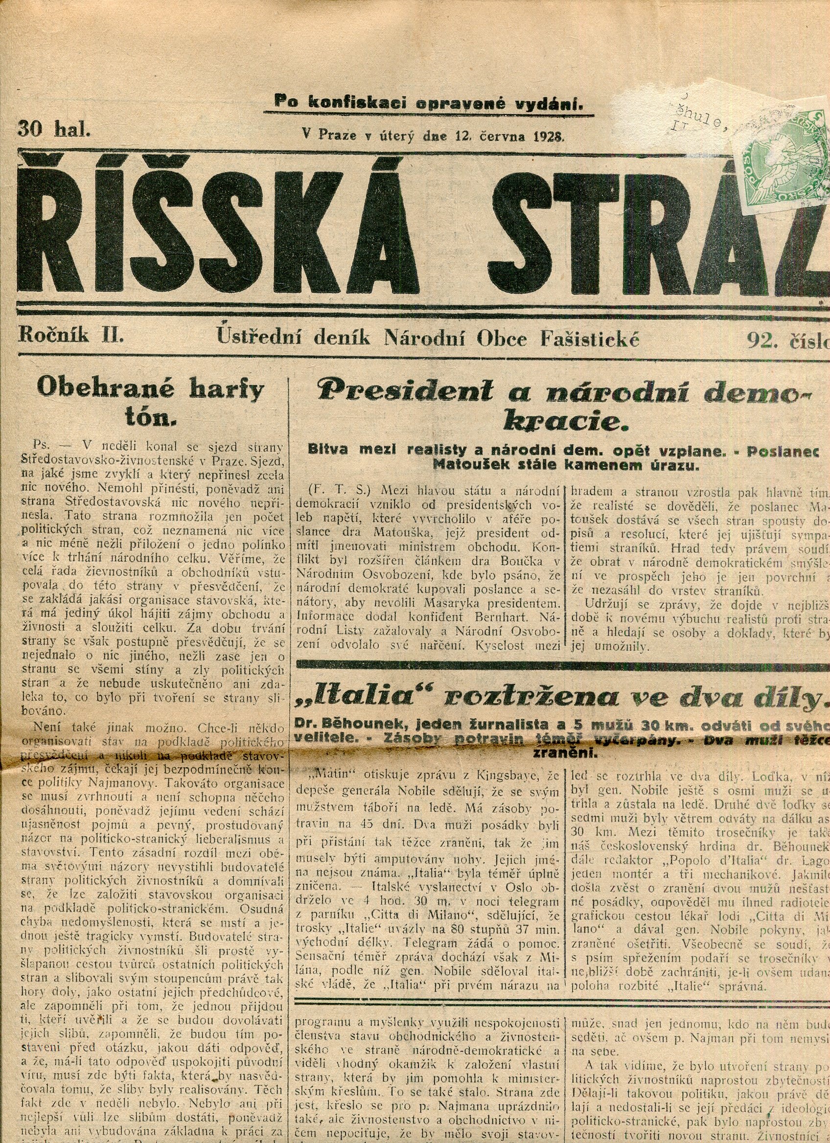Říšská stráž (6.6.1928) Ústřední deník Národní obce fašistické (staré noviny, fašisté, 1. republika)