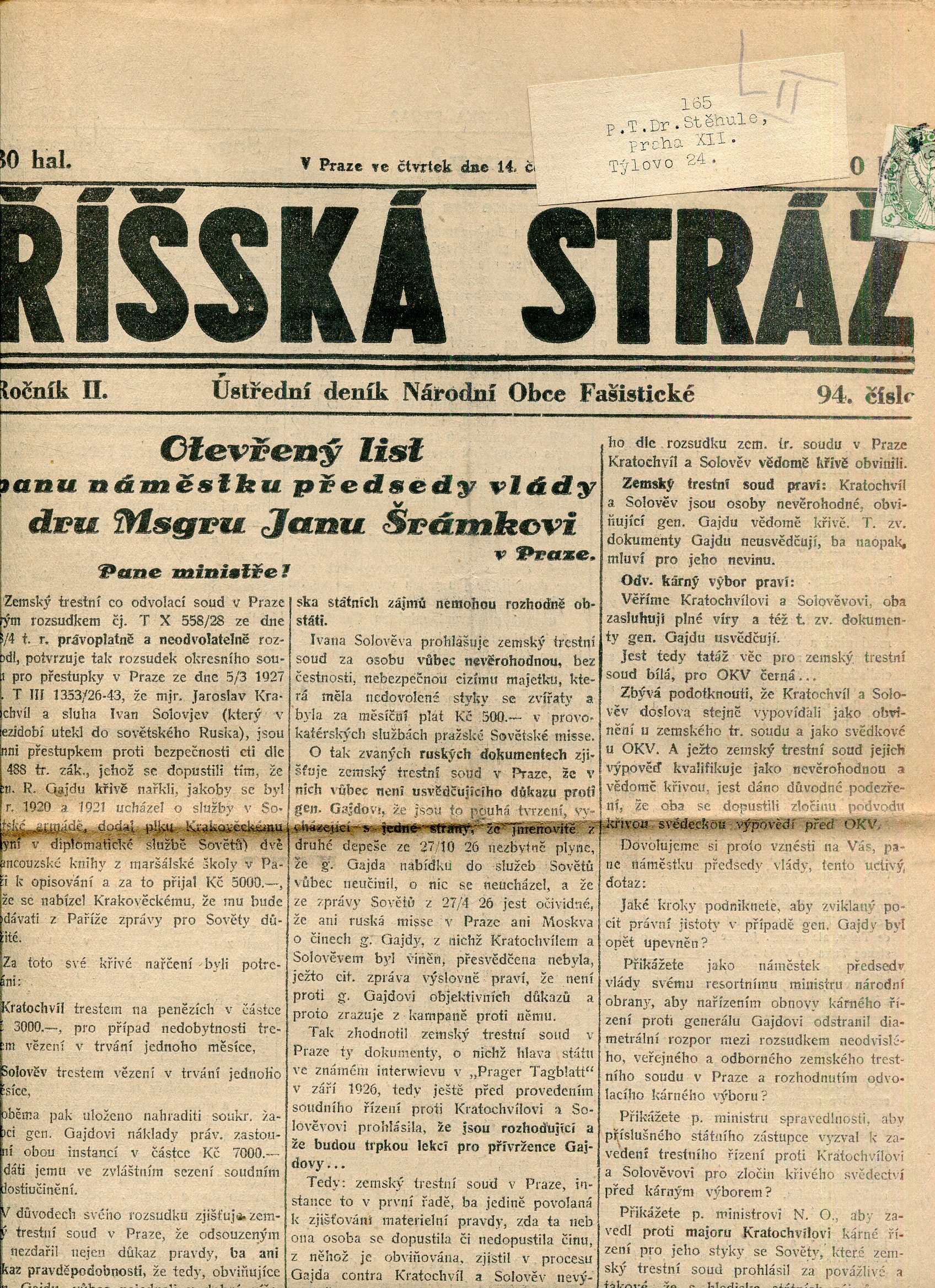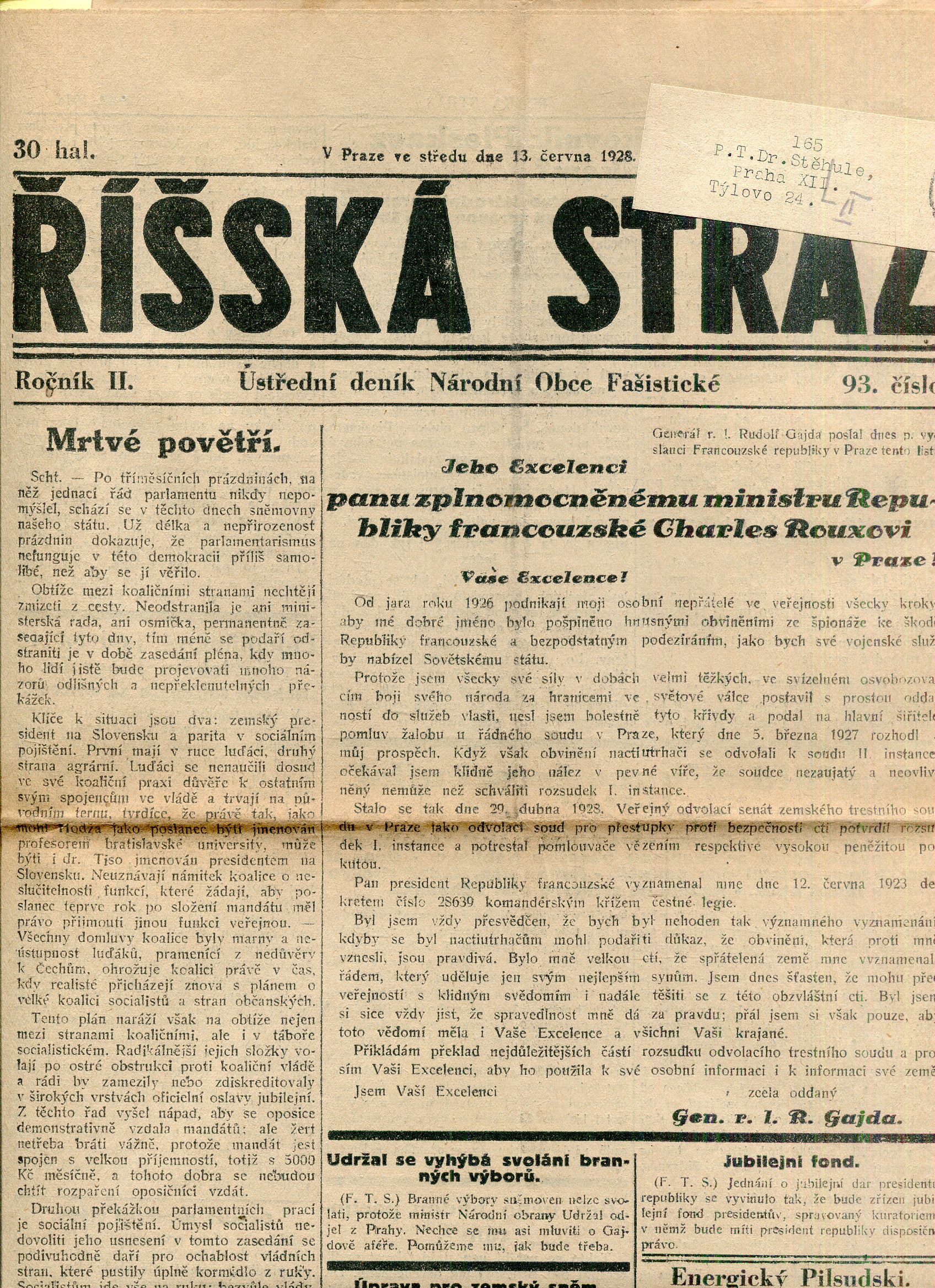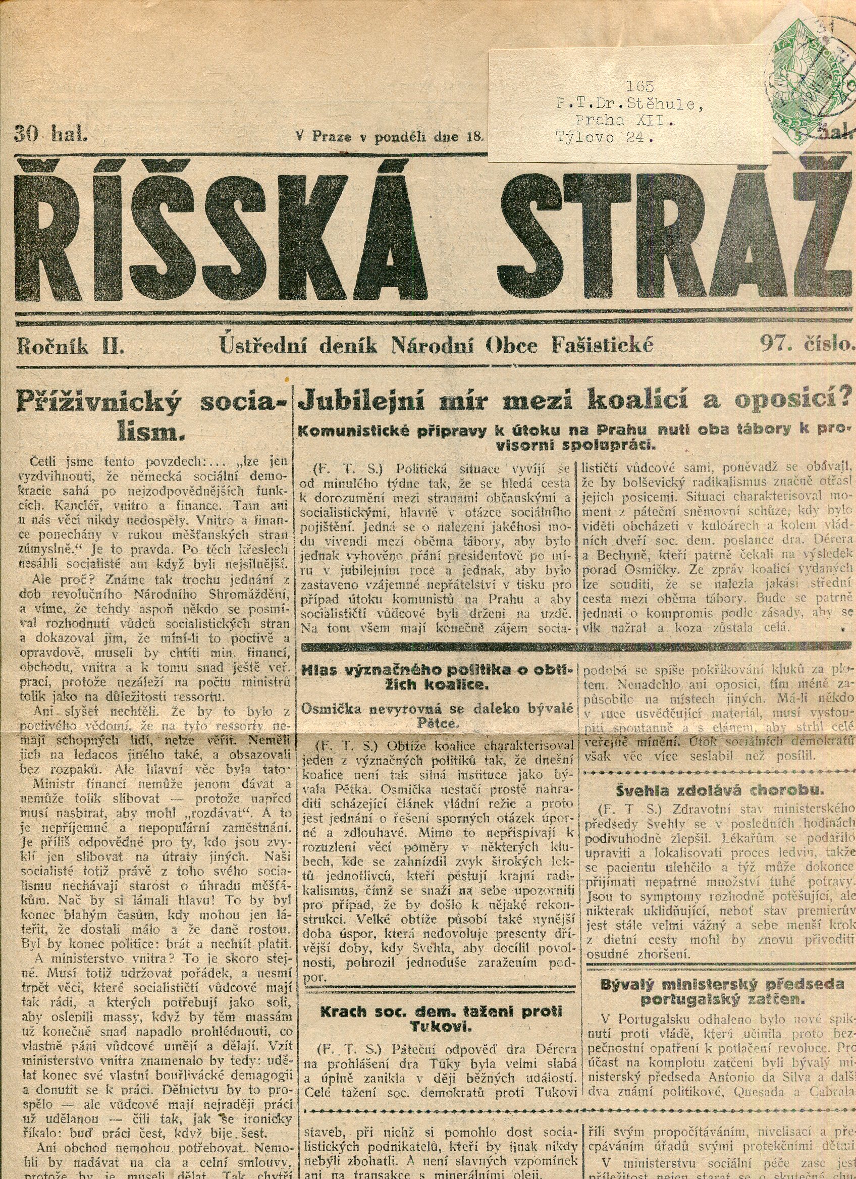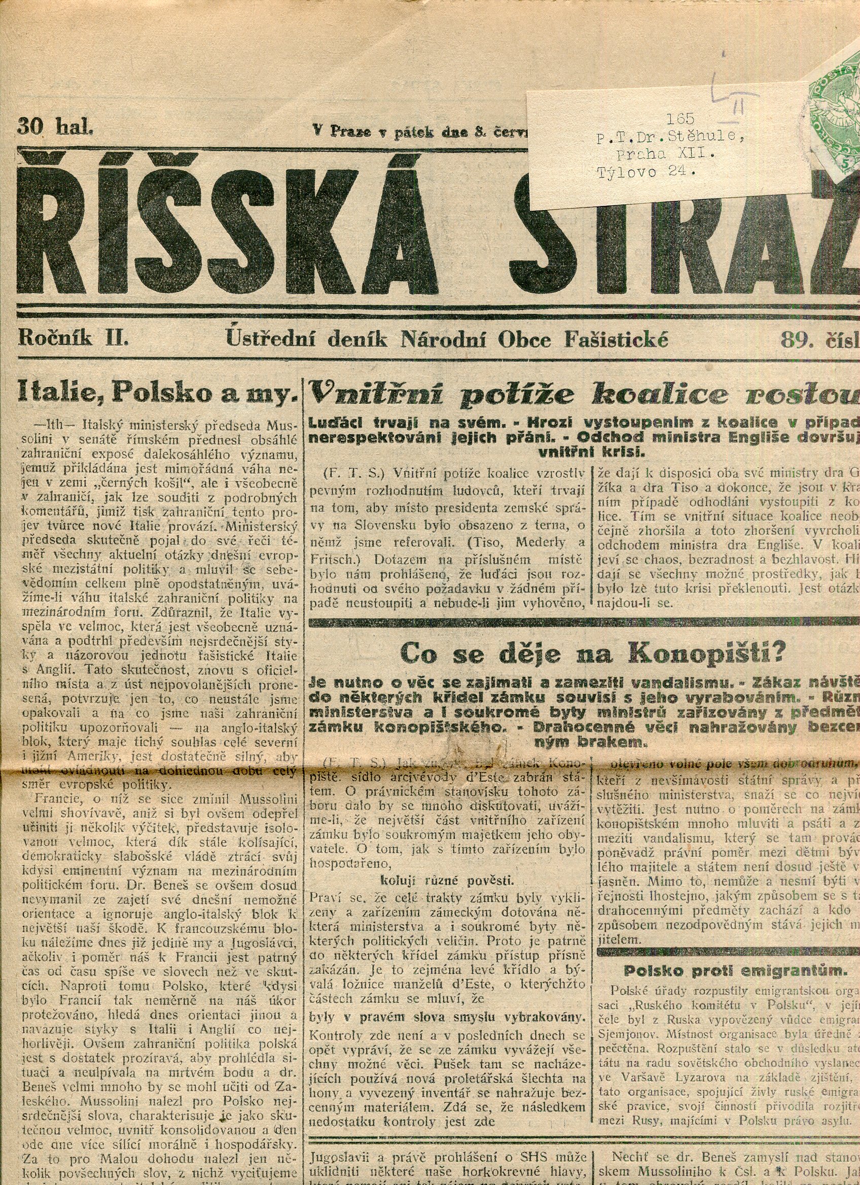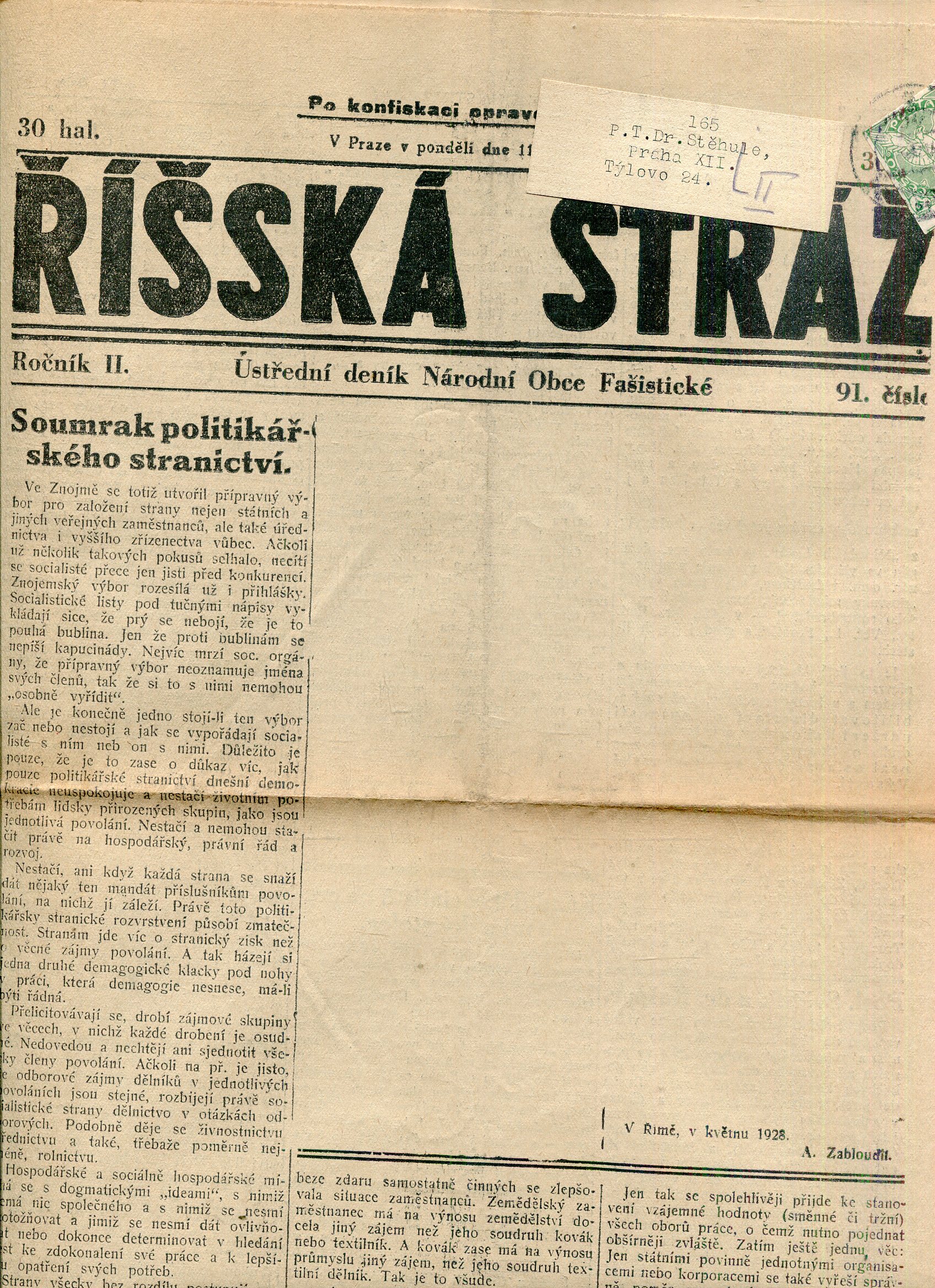 Říšská stráž (6.6.1928) Ústřední deník Národní obce fašistické (staré noviny, fašisté, 1. republika)