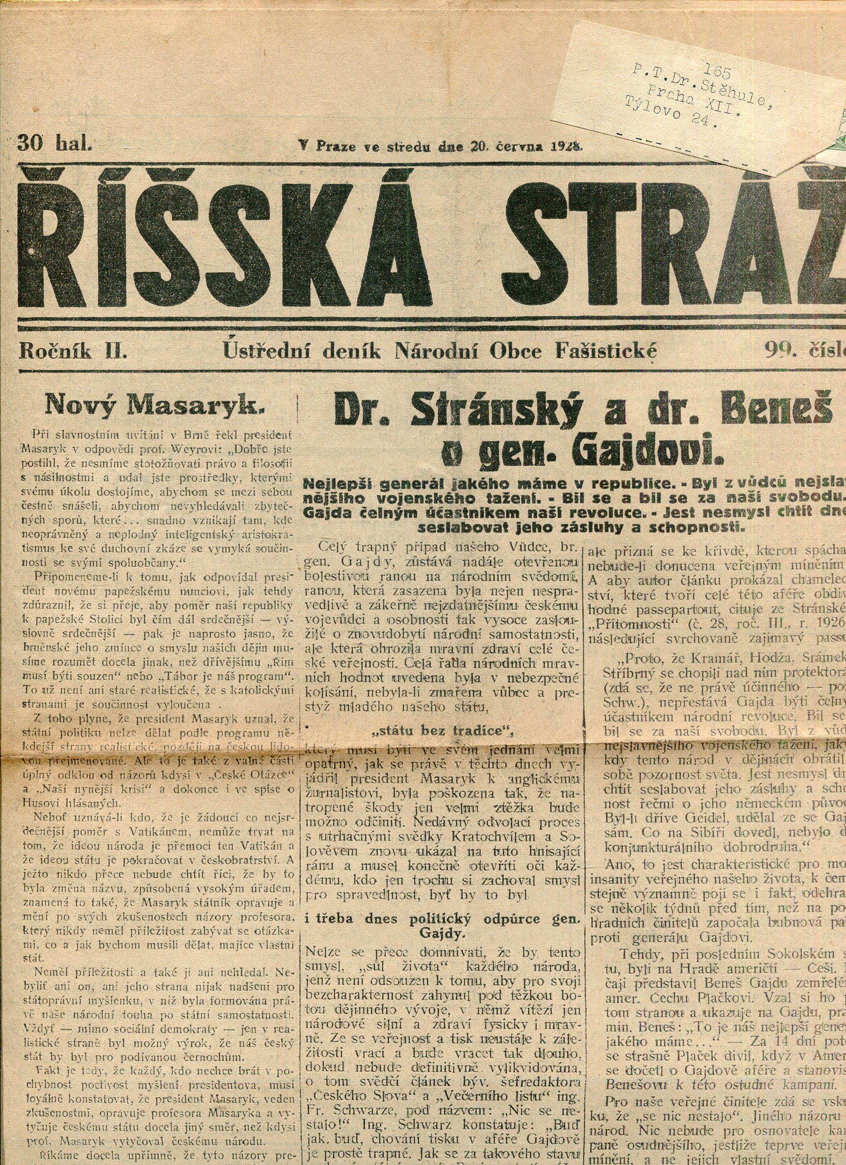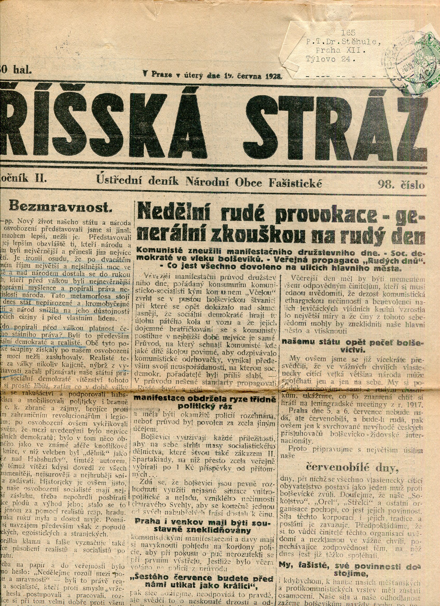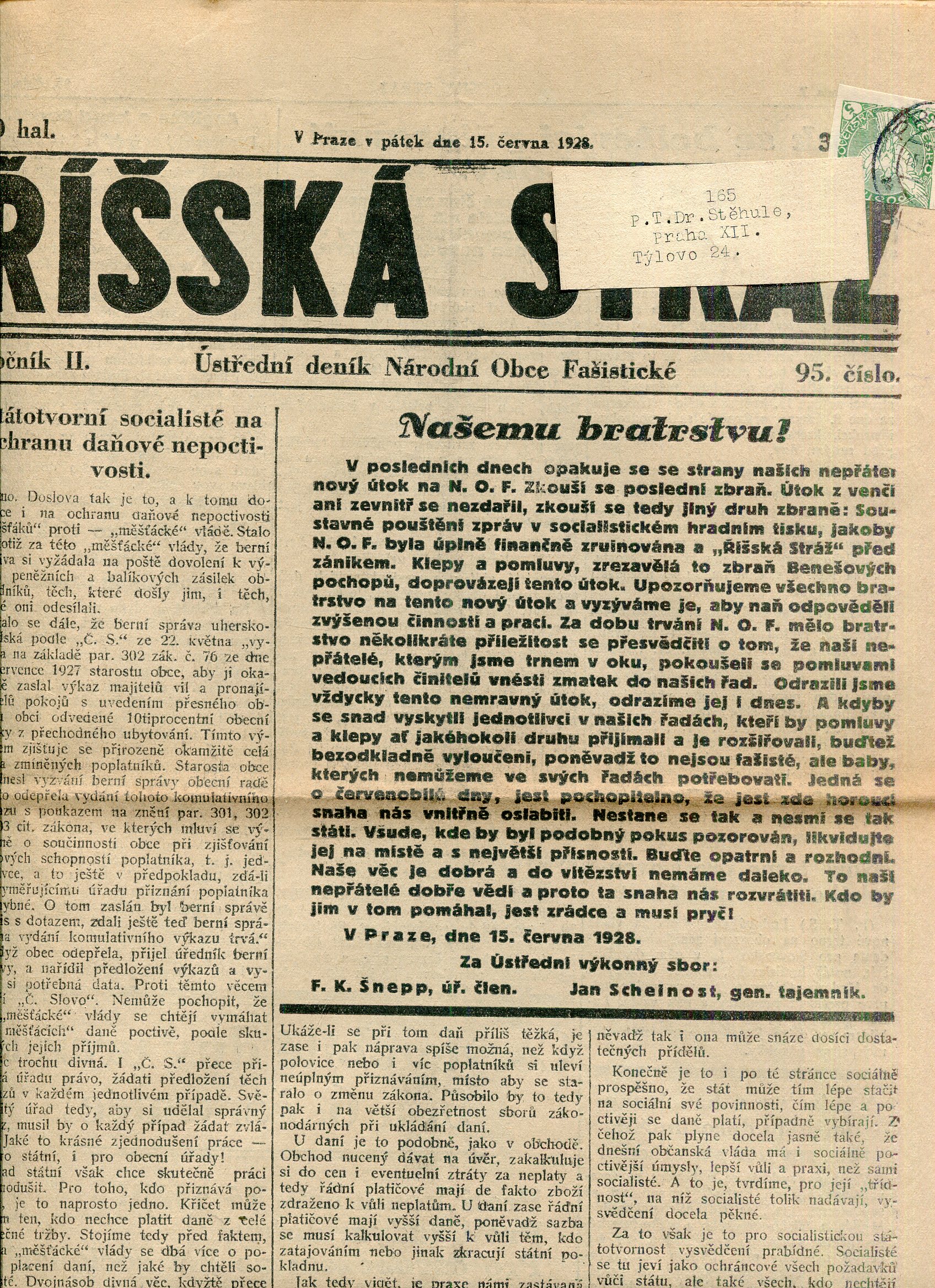 Říšská stráž (9.6.1928) Ústřední deník Národní obce fašistické (staré noviny, fašisté, 1. republika)