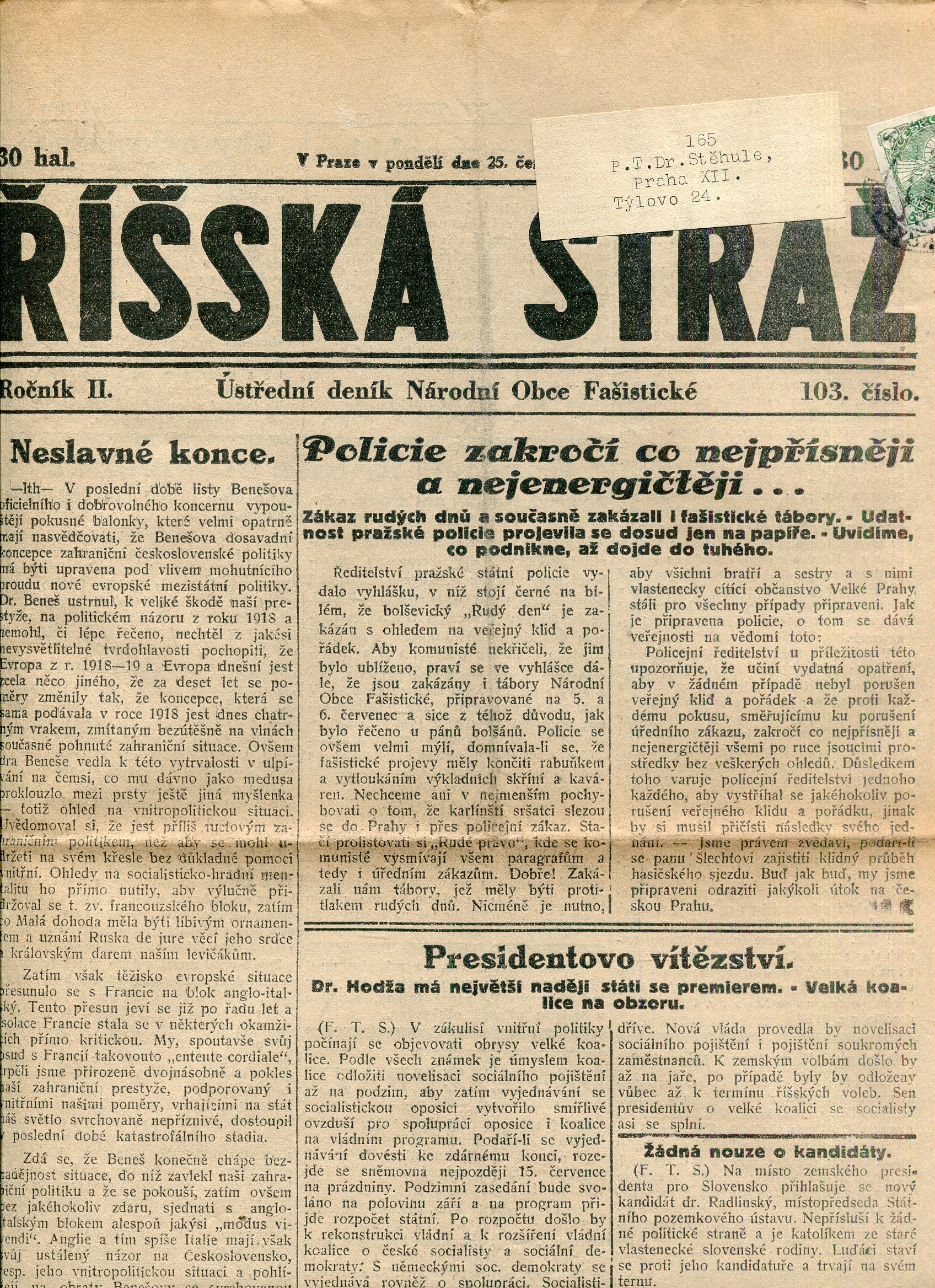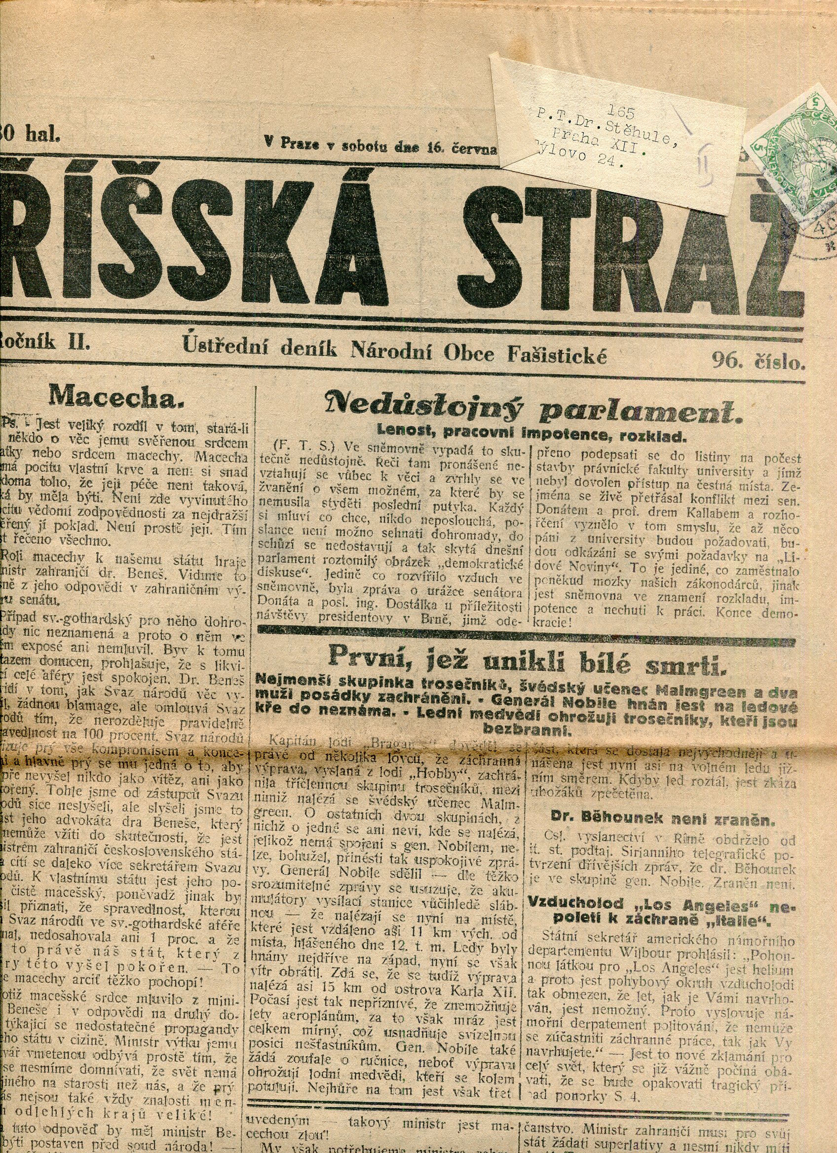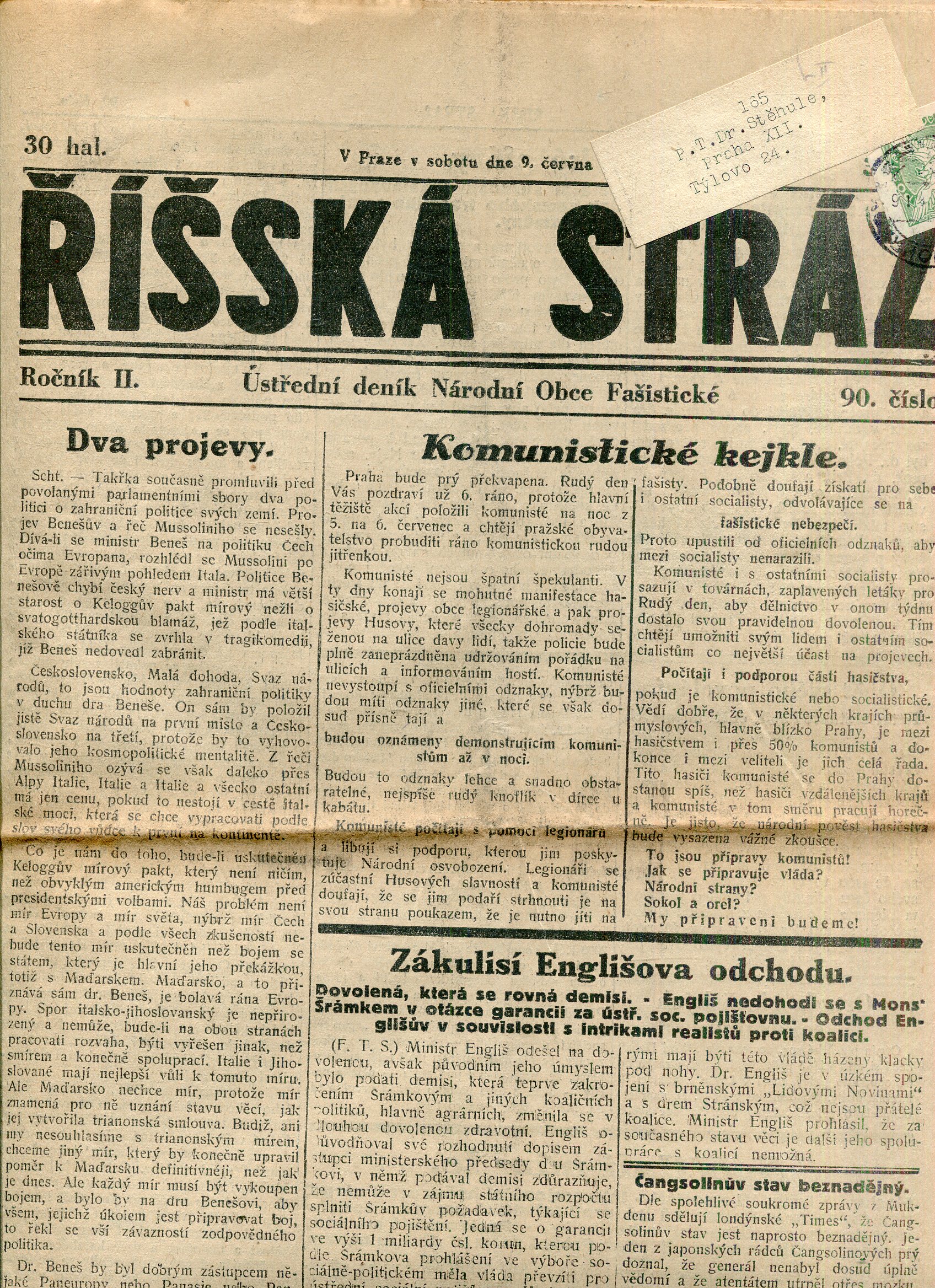 Říšská stráž (9.6.1928) Ústřední deník Národní obce fašistické (staré noviny, fašisté, 1. republika)