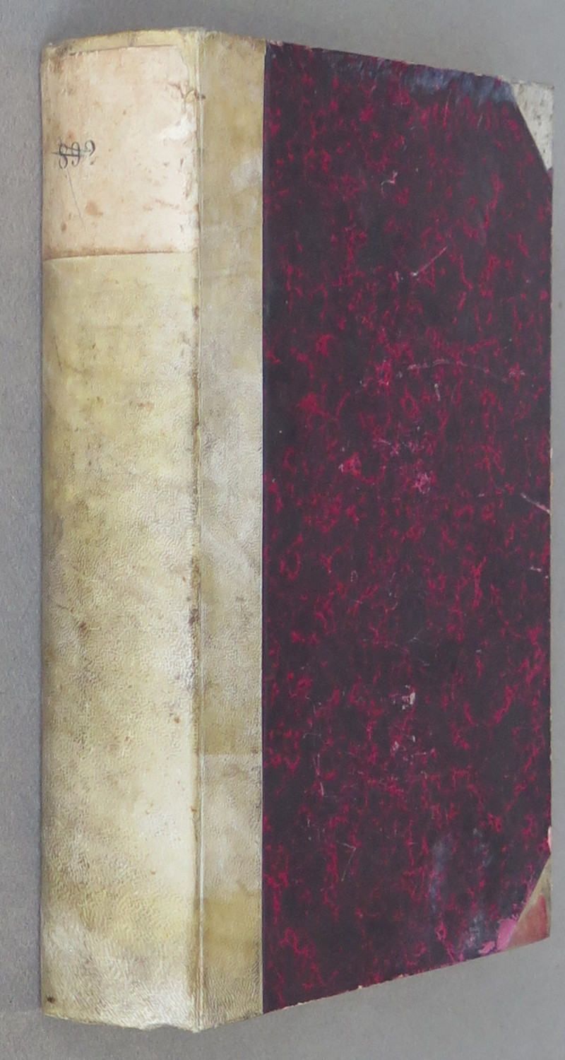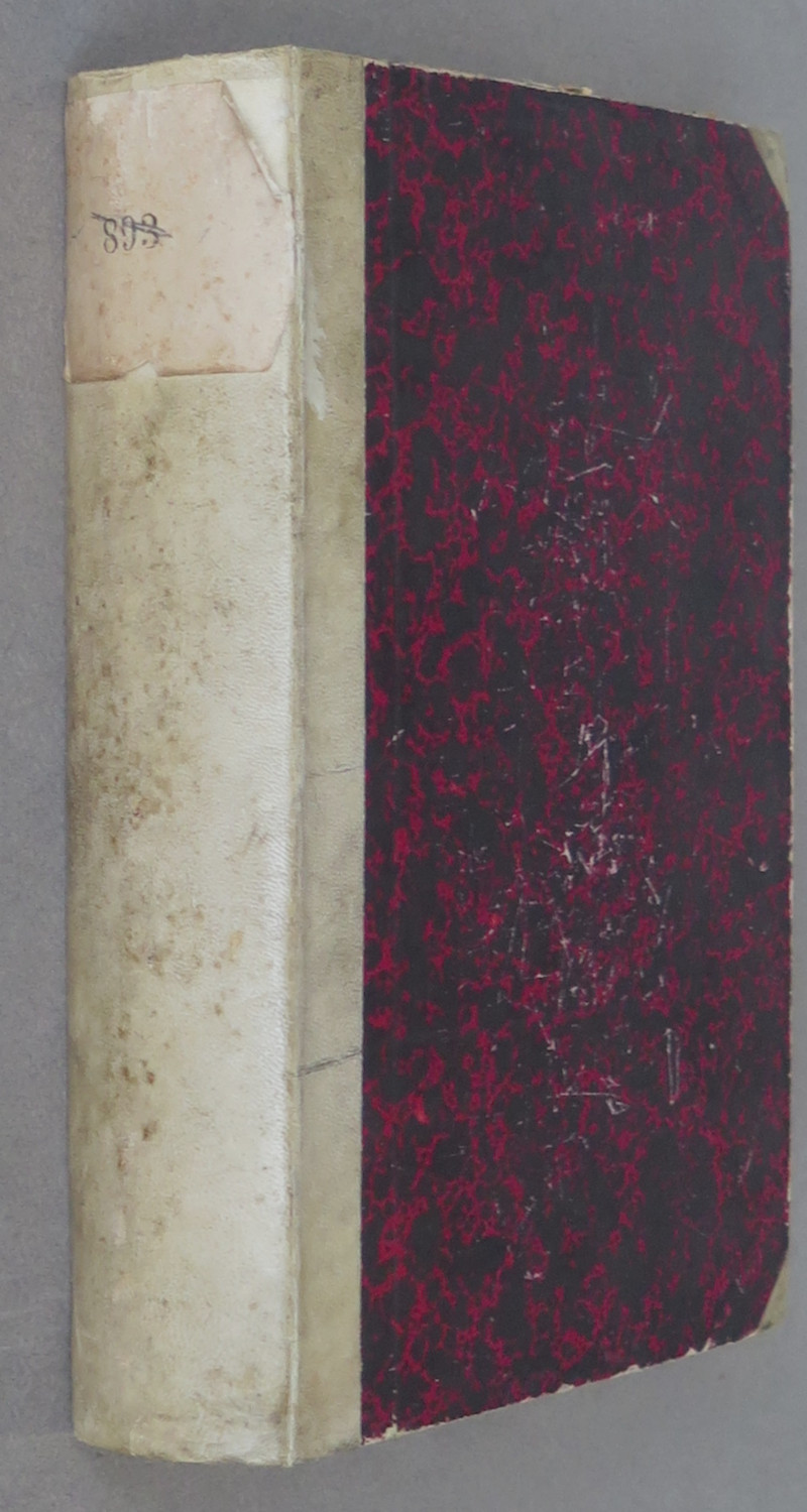 Dobrý stav; desky opotřebované, na hřbetu a zadní desce nalepen štítek, na přední předsádce je štítek, signatura, poznámky a razítka, na některých stranách je razítko knihovny, na předsádkách a pár st