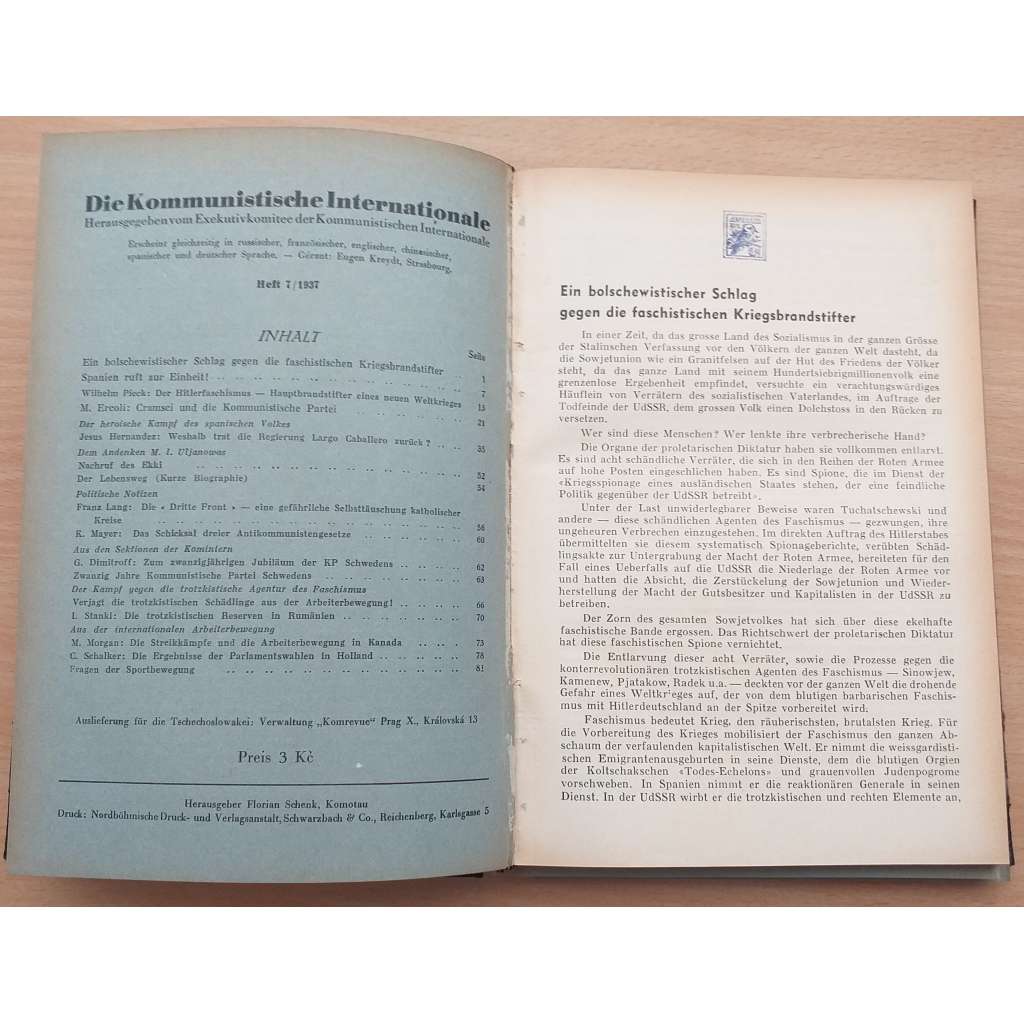Vydáno výkonným výborem Komunistické internacionály. Válka za nezávislost národů Španělska, nové jevy ve studentském hnutí, hitlerovský fašismus, dělnické hnutí v Kanadě, akční jednota dělnické třídy, lidová fronta v Německu, boj mezi fašismem a demokracií v Maďarsku, agrese japonského imperialismu proti Číně, lidová fronta v USA, stávka polských rolníků