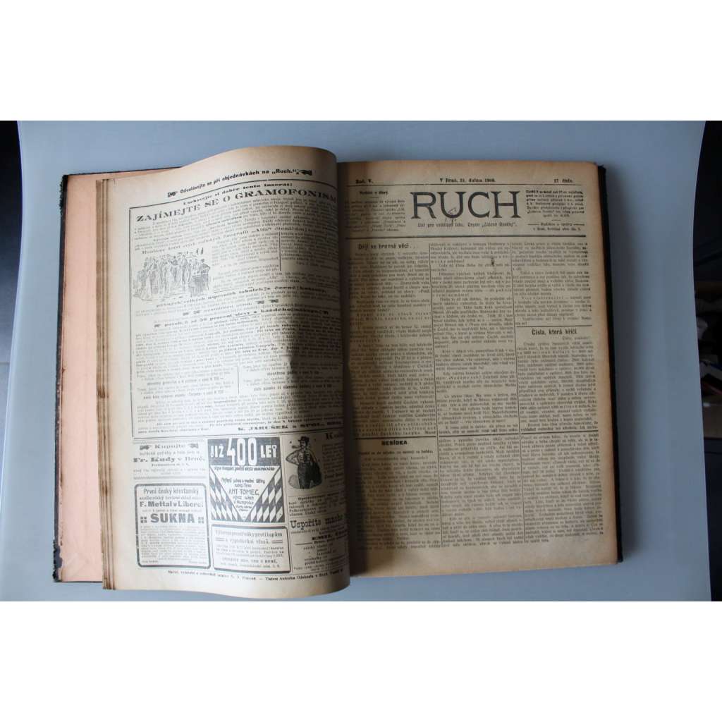 Ruch. List pro vzdělání lidu 1908, roč. V.; Česká domácnosť 1908, Domácnost a Hospodářství 1908, Pravda 1908, Mladý Čech 1908 (přílohy Ruchu) (noviny, Rakousko-Uhersko, Brno)