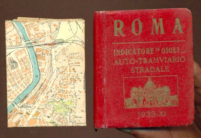 Rom: Mario Gigli 1933, pův. celoplátěná vazba se zlatou ražbou, 271 stran se skládaným barevným plánem Říma, 18° (7,5 x 9,5 cm; mapa: 34,5 x 39,5 cm)