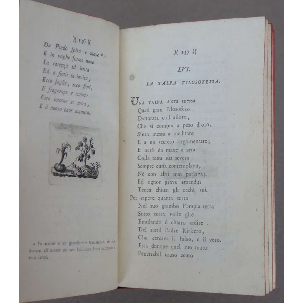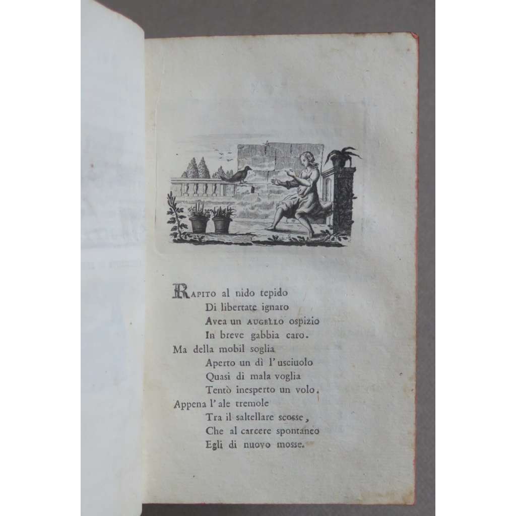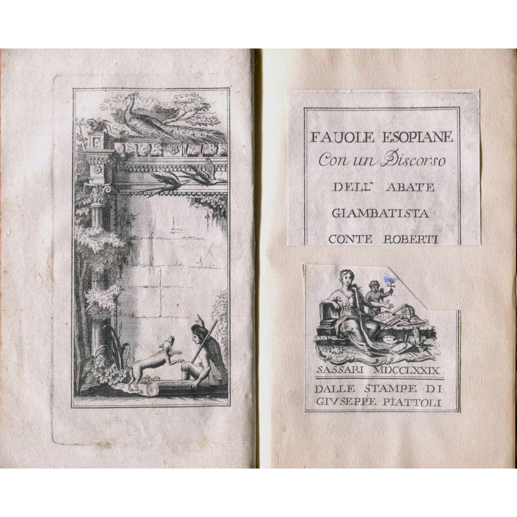 Veršované bajky významného italského spisovatele a básníka Giambattisty Robertiho (1719–1786) napsané jako kritika morálního úpadku 18. století; bajky jsou uvedeny autorovou předmluvou. Výtisk obsahuje mědirytový frontispis, mědirytový titul s vinětou (jen částečně dochován) a přes 20 drobných mědirytových ilustrací použitých viněty. Autorem rytin je rytec a malíř Giuseppe Piattoli (1748–1834). Podle titulní strany vydáno v sardinském Sassari roku 1779, podle tiráže na poslední straně vytištěno v červnu 1781.