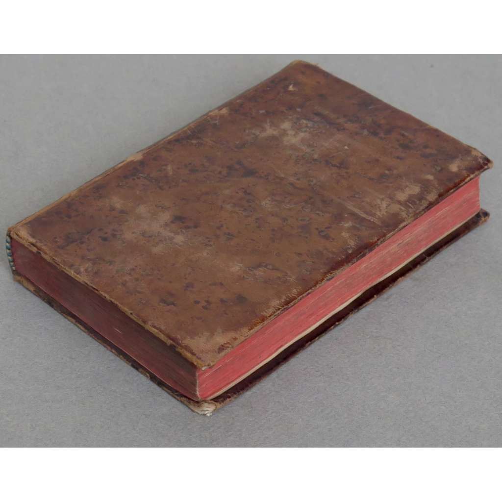 Stav knihy: Dobrý stav; kůže opotřebovaná, zlacení částečně setřeno, štítek s titulem částečně odlepen, horní ořízka mírně ztmavlá, na druhé (nezdobené) přední předsádce je stará signatura psaná perem, titulní list jen částečně zachován (titul, viněta a impresum nalepeny na prázdný list), stránky čisté, jen výjimečně s drobnou hnědou skvrnkou, jeden list má na okraji nepatrnou ztrátu.