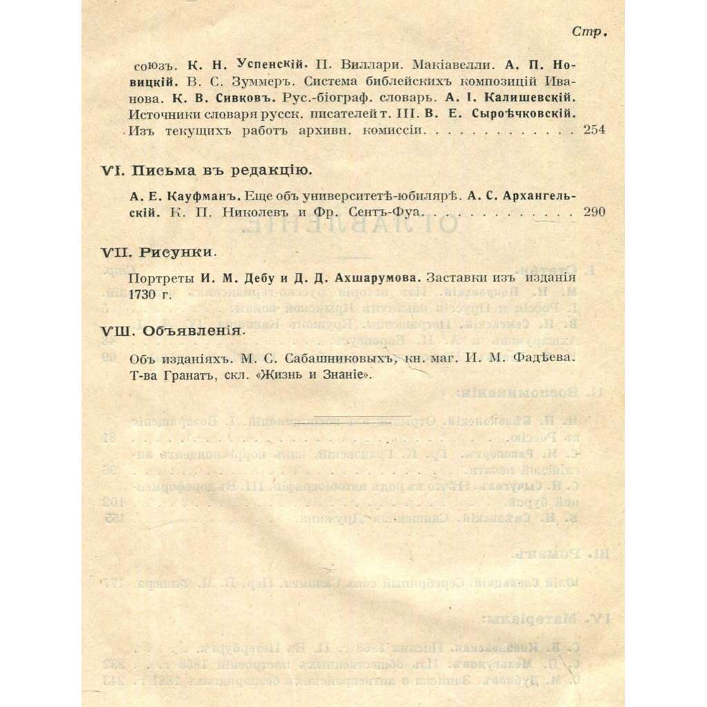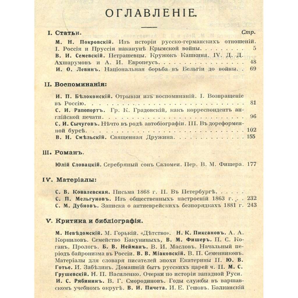 Jedno číslo (březen 1916) významného ruského historického měsíčníku zaměřeného především na dějiny progresivních hnutí, intelektuálních směrů a literatury Ruska. Viz naskenovaný obsah. Ilustrováno dvěma portréty; stránky jsou zdobeny vlysy a koncovými vinětami.