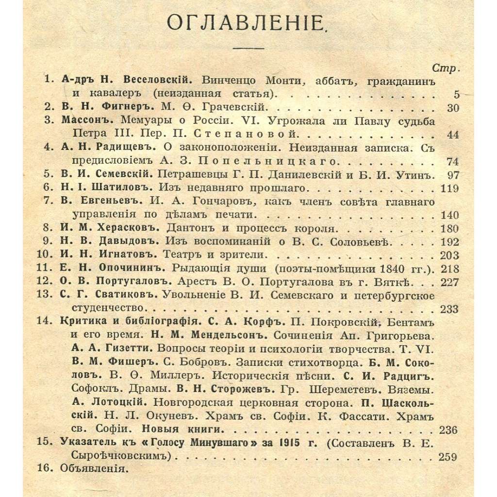 Jedno číslo (prosinec 1916) významného ruského historického měsíčníku zaměřeného především na dějiny progresivních hnutí, intelektuálních směrů a literatury Ruska. Viz naskenovaný obsah. Stránky jsou zdobeny vlysy a koncovými vinětami.