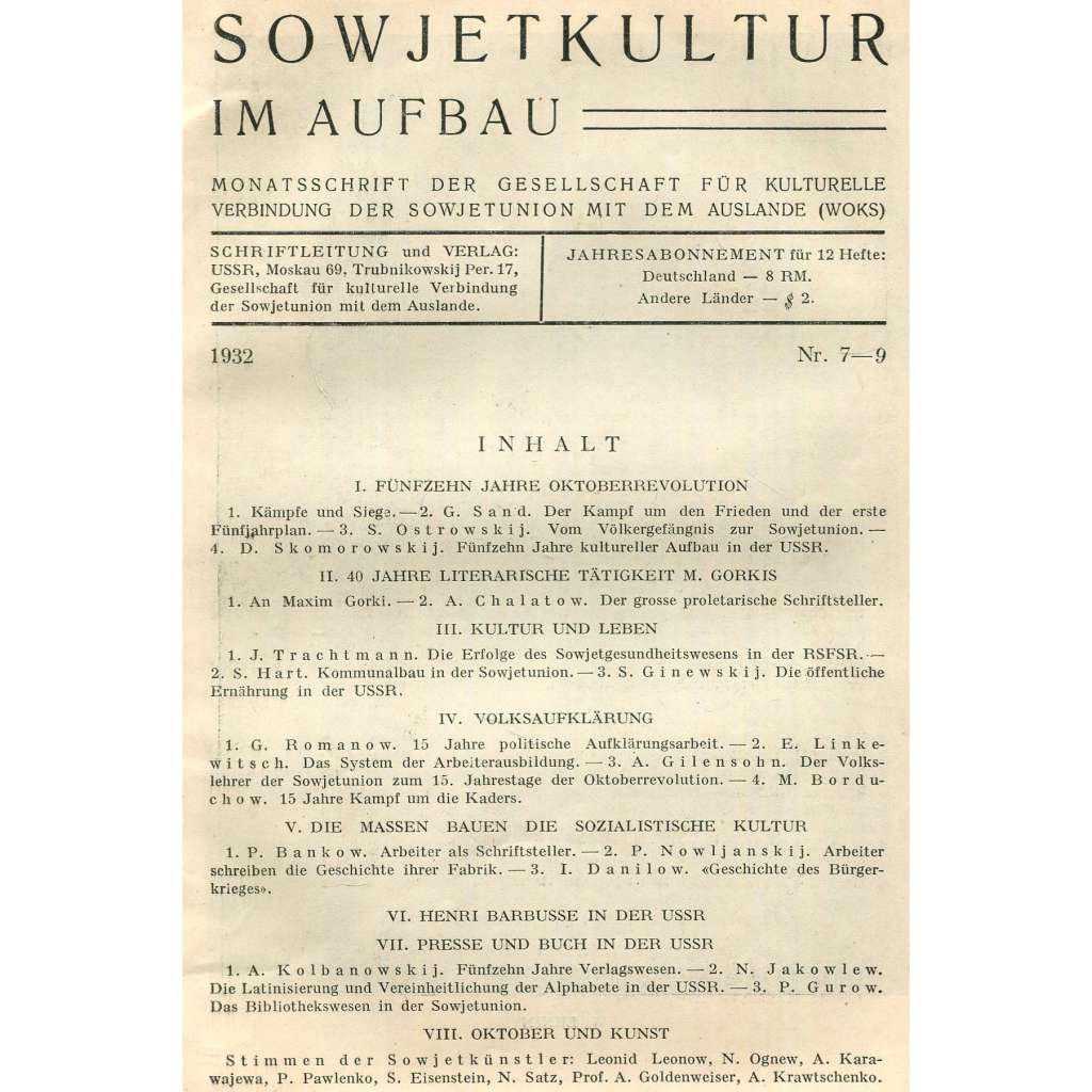 Sowjetkultur im Aufbau, 1932, č. 7-9 [Sovětský svaz; SSSR; časopis; Říjnová revoluce; VŘSR; sovětská kultura; literatura]