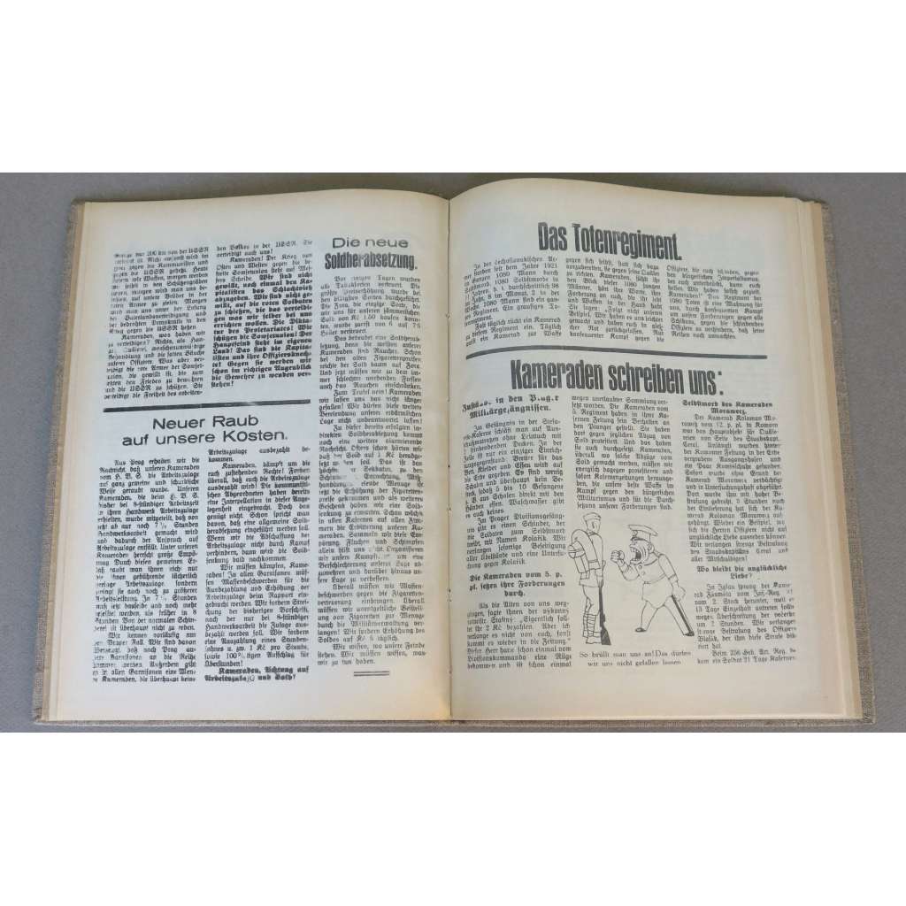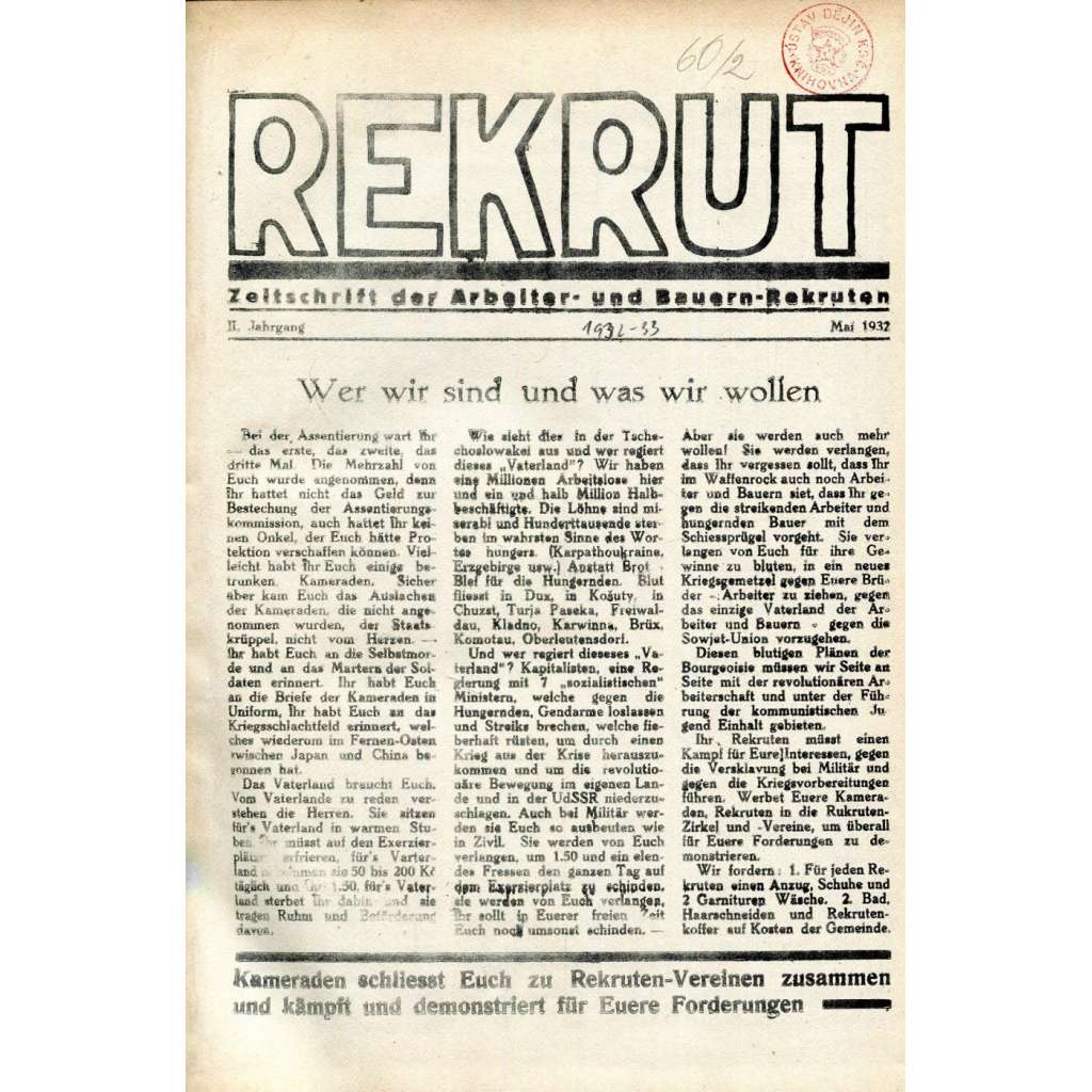 Dva ilegální antimilitaristické německojazyčné časopisy vydávané Komunistickou stranou Československa pro vojáky československé armády za první republiky; svázáno knihovnou do jednoho svazku. První dva čísla nesou titul "Rekrut", vydány byly v květnu a září 1932. Dalších 21 čísel pod titulem "Der Soldat" bylo vydáno v letech 1932–1933 (ročník 3 je podle všeho kompletní; u ročníku 4 je úplnost nejistá). Ilustrováno karikaturami a fotografiemi. Časopisy se nenacházejí v žádné české či jiné knihovně. Velmi dobře zachováno.