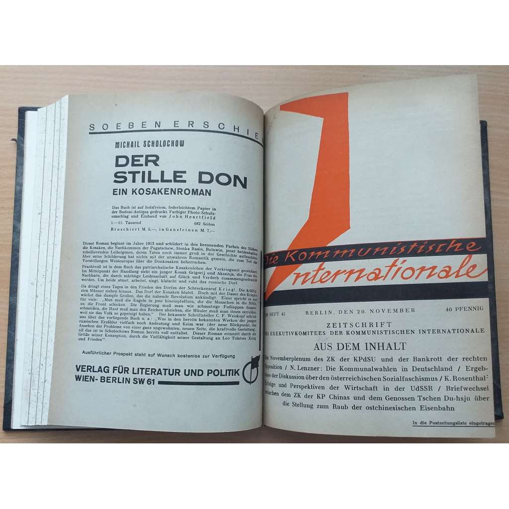 Časopis Výkonného výboru Komunistické internacionály. Třídní boj v Německu, komunální volby v Německu, polský fašismus, fašistický převrat v Rakousku, československý obuvník Baťa, hospodářství v SSSR, sovětský pětiletý plán, třídní odbory za vlády Mussoliniho
