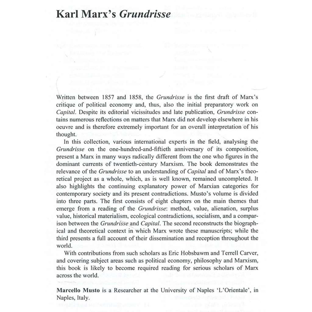 In this collection, various international experts in the field, analysing the Grundrisse on the one-hundred-and-fiftieth anniversary of its composition, present a Marx in many ways radically different from the one who figures in the dominant currents of twentieth-century Marxism. The book demonstrates the relevance of the Grundrisse to an understanding of Capital and of Marx's theo-retical project as a whole, which, as is well known, remained uncompleted. It also highlights the continuing explanatory power of Marxian categories for contemporary society and its present contradictions. Musto's volume is divided into three parts. The first consists of eight chapters on the main themes that emerge from a reading of the Grundrisse: method, value, alienation, surplus value, historical materialism, ecological contradictions, socialism, and a compar-ison between the Grundrisse and Capital. The second reconstructs the biograph-ical and theoretical context in which Marx wrote these manuscripts; while the third presents a full account of their dissemination and reception throughout the world.