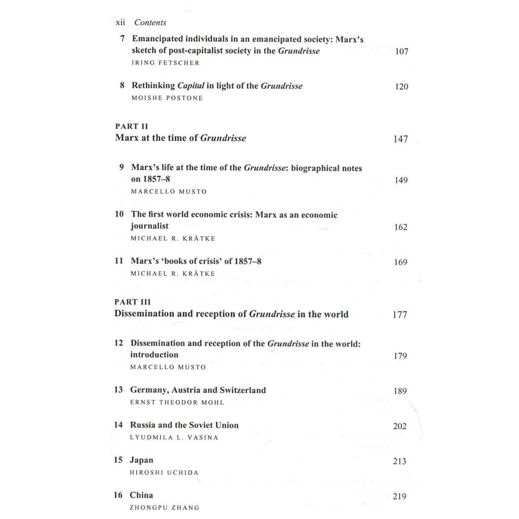 Vynikající sborník interpretačních studií o Marxových ekonomických rukopisech zvaných Grundrisse, doplněno intelektuálně-biografickými studiemi a krátkými kapitolami o recepci Grundrisse v různých zemích (od Německa po Brazílii a Portugalsko). Autory všech textů jsou přední marxologové. Viz naskenovaný obsah prvních dvou částí.