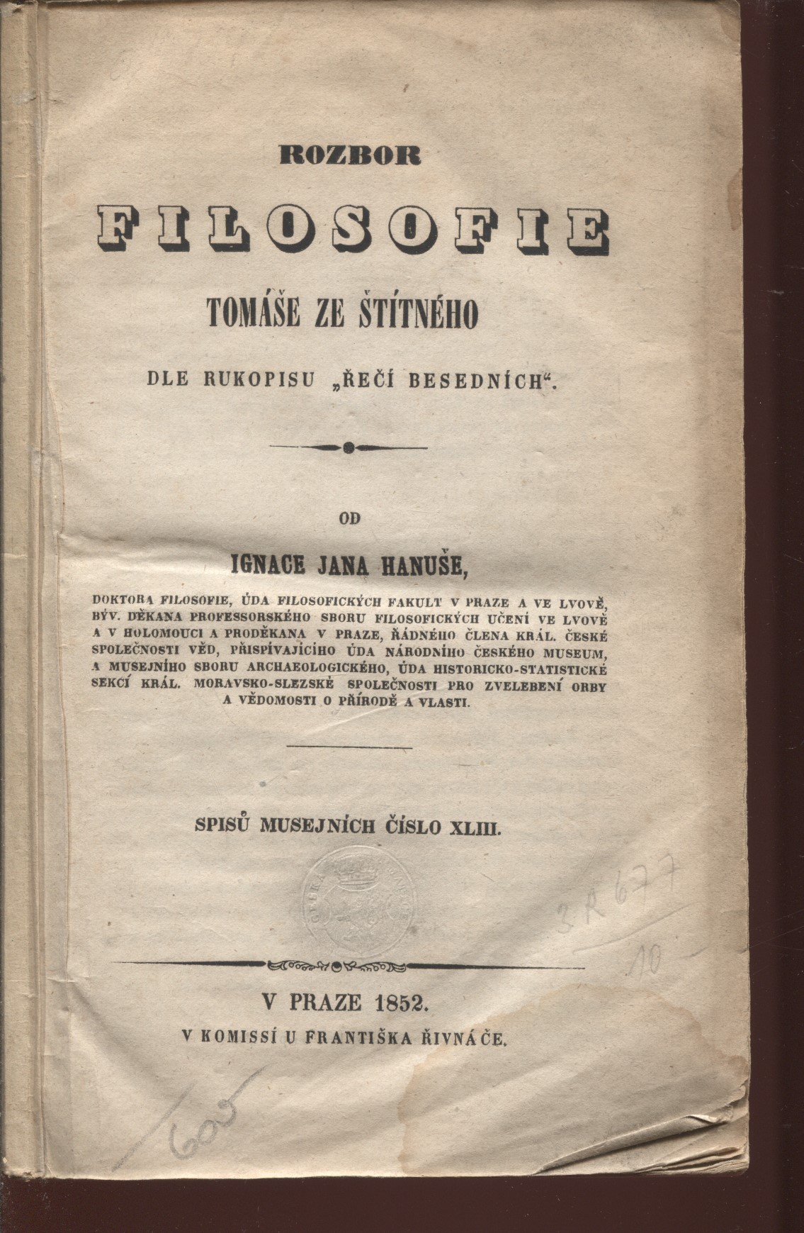 Poloplátěná vazba, 370 str., 8°. Praha, Kronbergr a Řiwnáč, 1844.