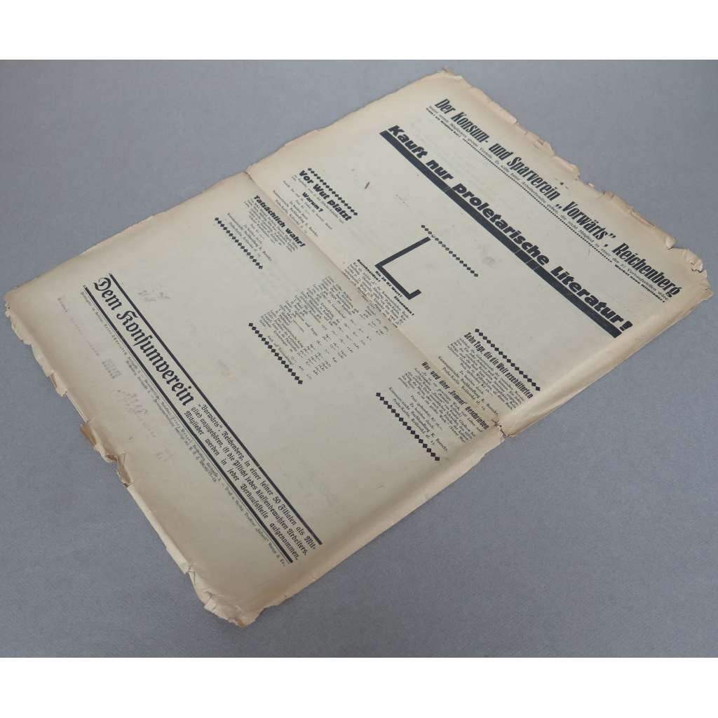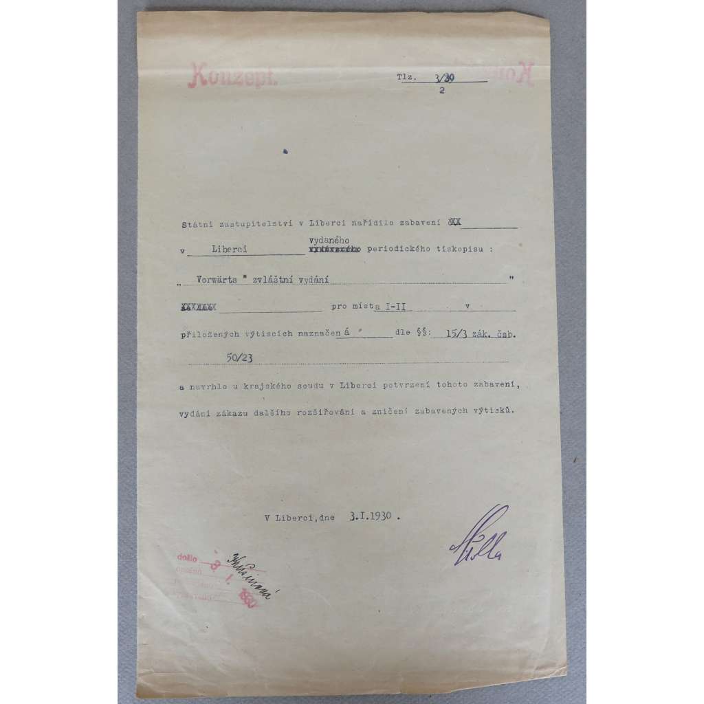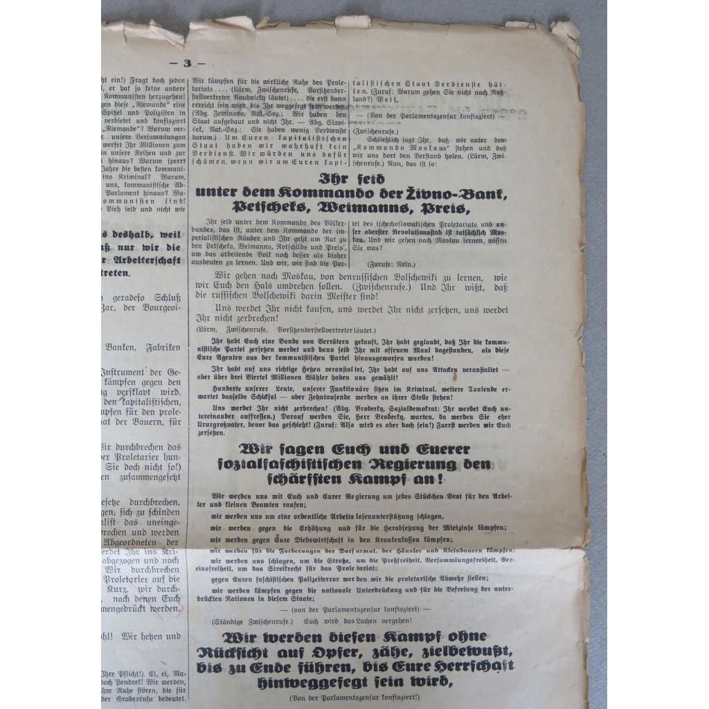 Zvláštní vydání libereckého komunistického listu "Vorwärts" obsahující neblaze proslulý první parlamentní projev Klementa Gottwalda z 22. prosince 1929 ("Komunistické mene tekel v pražském Rudolfinu. [...] Stenografický záznam parlamentního projevu soudruha Gottwalda z 22. prosince 1929"). Jde o výtisk prvního, tj. necenzurovaného vydání, velmi pravděpodobně jediný dochovaný. Vytištěn na konci prosince 1929 nebo na Nový rok. Na straně 3 jsou cenzorem Státního zastupitelství vyznačeny závadné pasáže. Na titulní straně jsou razítka Státního zastupitelství, vloženy jsou instrukce téže instituce z počátku ledna 1930 (na jedné straně německy, na druhé česky; viz foto českého textu).