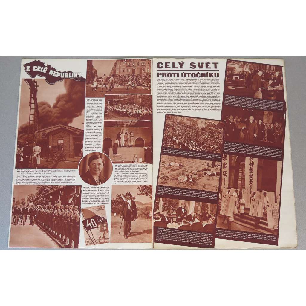 Jedno z čísel prvorepublikového antifašistického týdeníku (4. 9. 1938); bohatě ilustrováno hlubotiskovými reprodukcemi fotografií; na zadní části obálky je vzácná celostránková fotomontáž od Johna Heartfielda (1891–1968), proslulého německého výtvarníka, který během svého pražského exilu pracoval i pro několik československých periodik, v nichž byly publikovány české verze jeho fotomontáží.