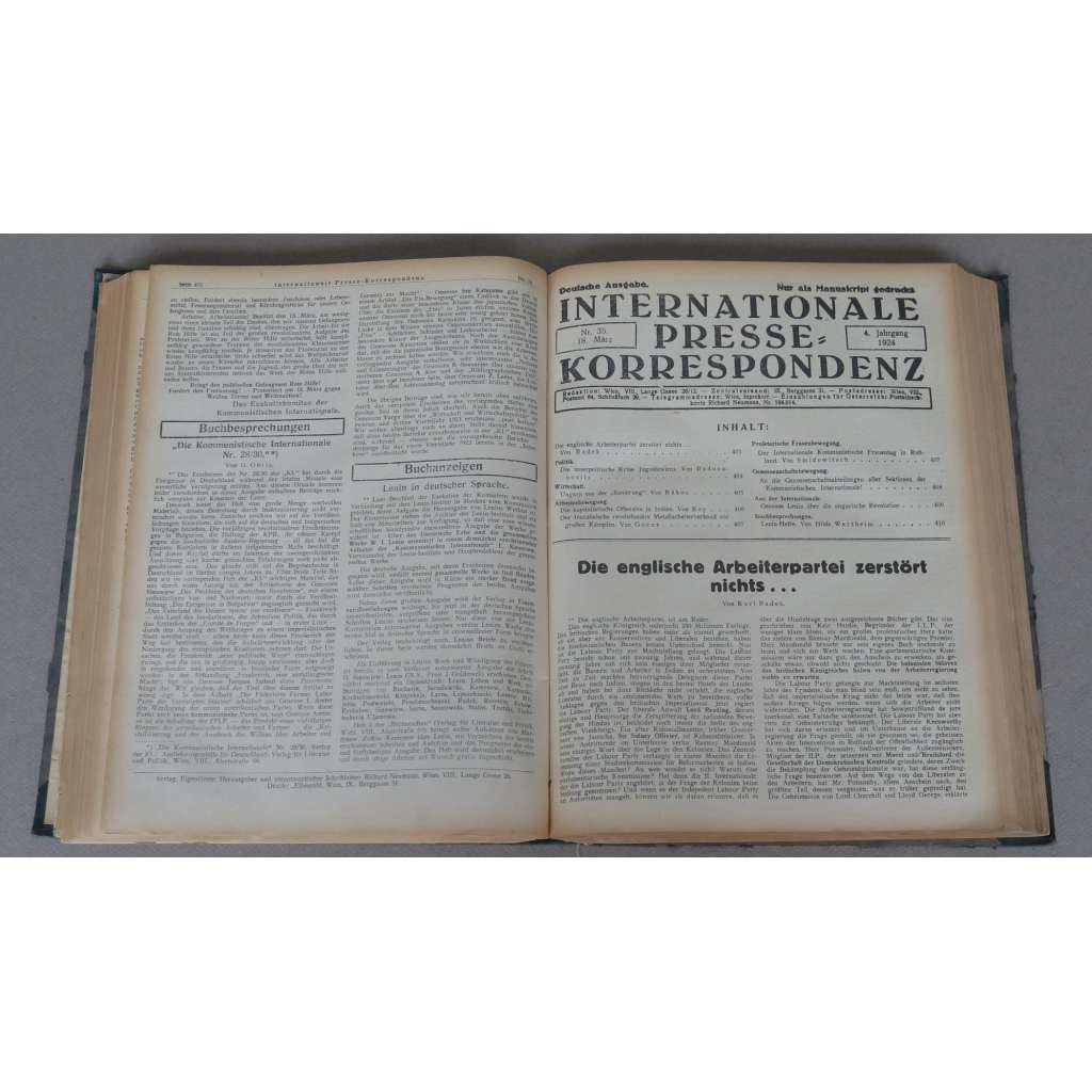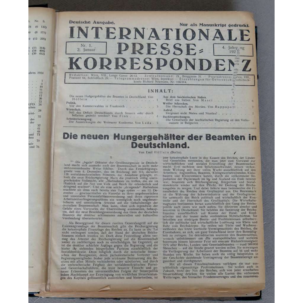 První polovina (Halbjahr) čtvrtého ročníku mezinárodní tiskové služby Komunistické internacionály. Zahrnuje čísla od 2. 1. (č. 1) do 27. 6. 1924 (č. 77); doplněno rejstříky pro tuto první polovinu ročníku; žádné číslo nechybí.