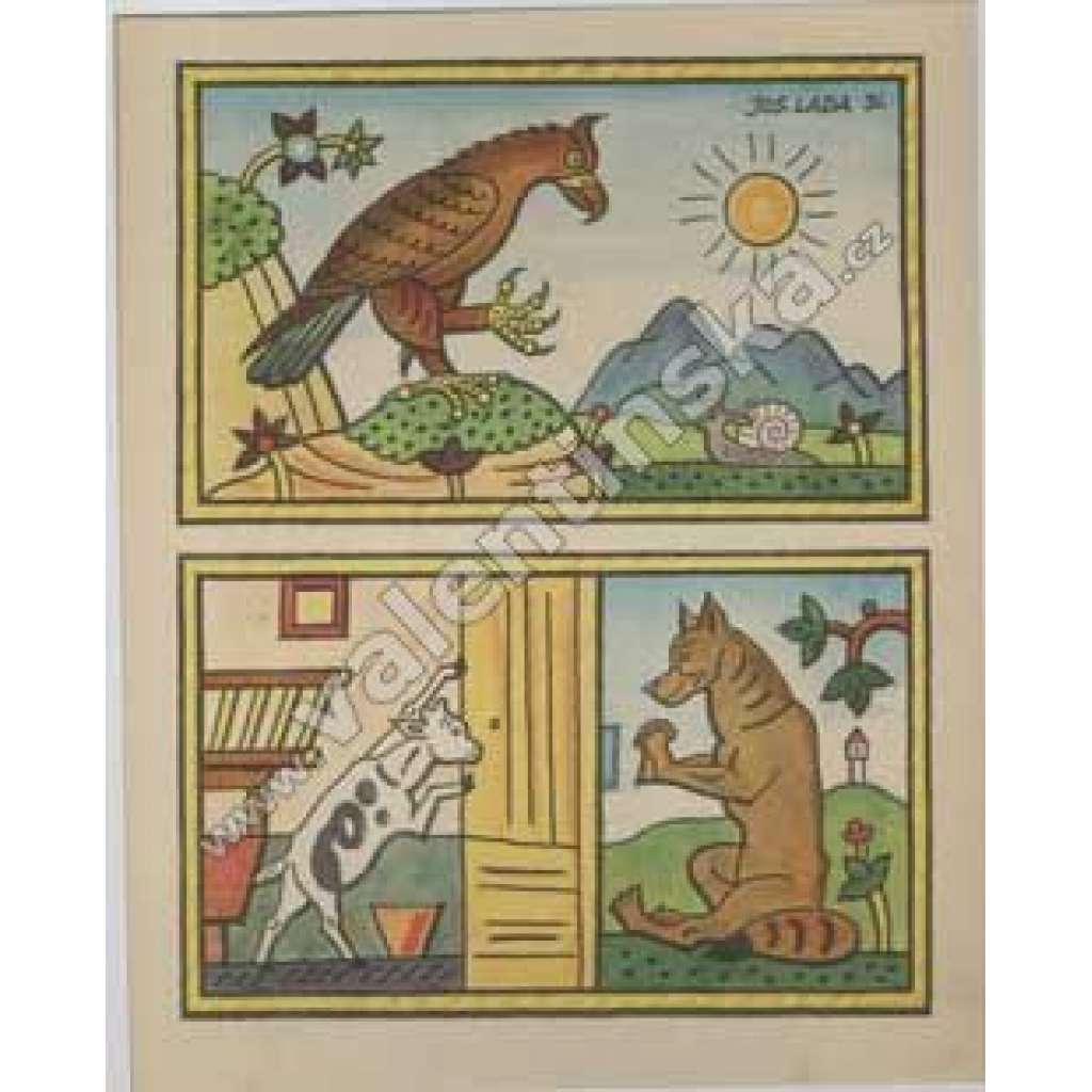 cislo L/6 Josef Lada/Sup,koza,vlk Barevná zinkografie z 30.let 20.století, rozmery 297x229 mm Lada Josef * Lada Josef *17. pros. 1887 v Hrusicích na Říčansku, čes. malíř. Zprvu se v Praze učil u malíře pokojů, pak knihařství. Navštěvoval večerní kursy na Uměl.-prům. škole u prof. Jakesche. R. 1907, obdržev výučný list knihařský, byl přijat jako řádný žák do školy prof. Dítěte. Tehdy se již jeho drobné kresby a náladové vignety objevovaly v Máji, Novinách mládeže a j.; hned napoprvé se v nich jevila jistá úpornost značně osobitého přízvuku. [Lada Josef] nevydržel dlouho na škole a uplatňoval se raději hned prakticky. V okruhu přátel, malířů a literátů (Brunner, Kratochvíl, Hašek, Gellner, Vika) vyrůstal umělecky. Jeho popularitu založily veselé kresby se zvířecími motivy, které se po debutu v Humor. Listech objevovaly porůznu v časopisech a jež později [Lada Josef] sestavil v celé obrazové cykly. V nich s prostomyslnou pravdivostí a bez falešného pathosu zosobňuje zvířecí miláčky, dává jim žít lidským životem se všemi jeho slabostmi, zachyceným topornou zkratkou v prostý a jímavý celek. Jeho veselé kresby nejsou karikaturami ve vlastním slova smyslu. Mají hluboce lidský přízvuk, povahu lid. obrázků, pramení z osobních zážitků venkovana, navazujíce tak přímo na práci Alšovu. Proti němu je však výtvarná řeč [Lada Josef]-ova drsnější a chudší tvarově. [Lada Josef]-ův typ čes. vesnice, objevující se v jeho kresbách spíše jako pozadí děje, je téměř prodloužením alšovské tradice. Do venkovského prostředí staví své muzikanty, ponocné, babky a výměnkáře, rozedrané kluky se psí čeládkou a s celým zvířecím ensemblem kraje. Celé [Lada Josef]-ovo dílo je naplněno dobrým rozmarem a přemírou životního optimismu, tlumočeného výtv. mluvou velmi srozumitelnou. Jako ilustrátor řady knih pro děti, pohádek a řikadel i Haškova Dobrého vojáka Švejka si [Lada Josef] záhy získal značnou oblibu v širokých vrstvách. Navrhl i scénické výpravy pro Nár. div. a napsal sám též několik pohádek (O kocourkovi, který mluvil a j.). Člen Mánesa a Hollara. Moje abeceda, Kalamajka, Svět zvířat, Ezopovy bajky, Erbenova řikadla, Veselý přírodopis, Vlkova svatba, Halekačky naší Kačky, Řikadla našeho Kadla, Veselý krok přes celý rok, Fidlovačka a j. O [Lada Josef]-ovi psal Jos. Kopta (Volné Směry, XXVII.); viz i J. [Lada Josef] o sobě (Panorama VIII.) a Jaromír Pečírka, [Lada Josef]-ovy vánoční pohlednice (Panorama roč. XII.). bsu-.