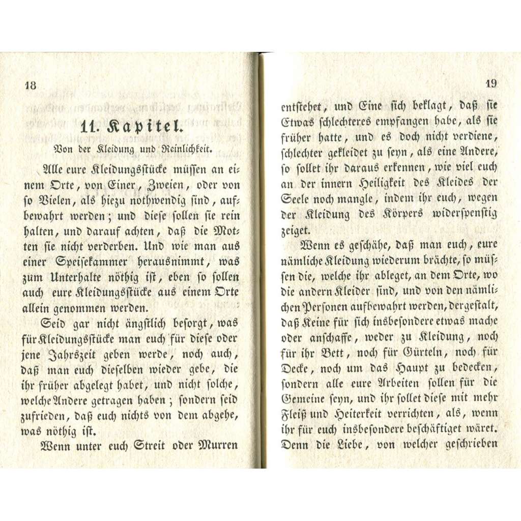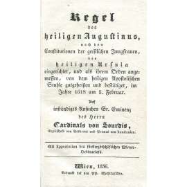 Titul a podtitul: "Regel des heiligen Augustinus, nach den Constitutionen der geistlichen Jungfrauen, der heiligen Ursula eingerichtet, und als ihrem Orden angemessen, von dem heiligen Apostolischen Stuhle gutgeheissen und bestätiget, im Jahre 1618 am 5. Februar".