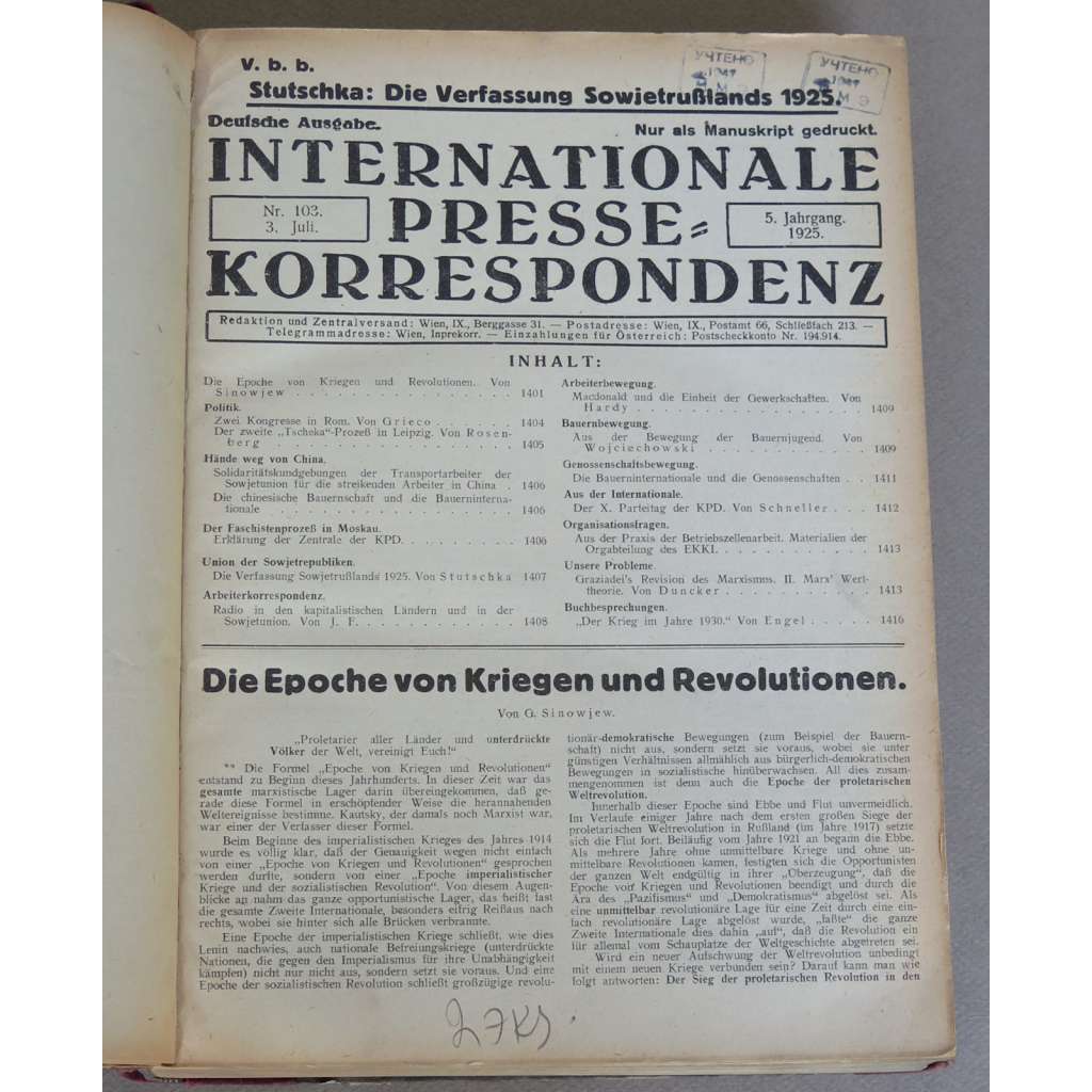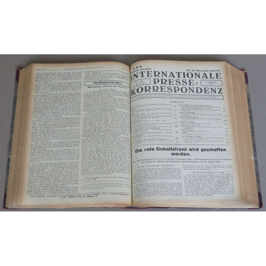 Druhá polovina (Halbjahr) pátého ročníku mezinárodní tiskové služby Komunistické internacionály. Zahrnuje čísla od 3. 7. (č. 103) do 31. 12. 1925 (č. 172); doplněno rejstříky pro tuto druhou polovinu ročníku; žádné číslo nechybí.
