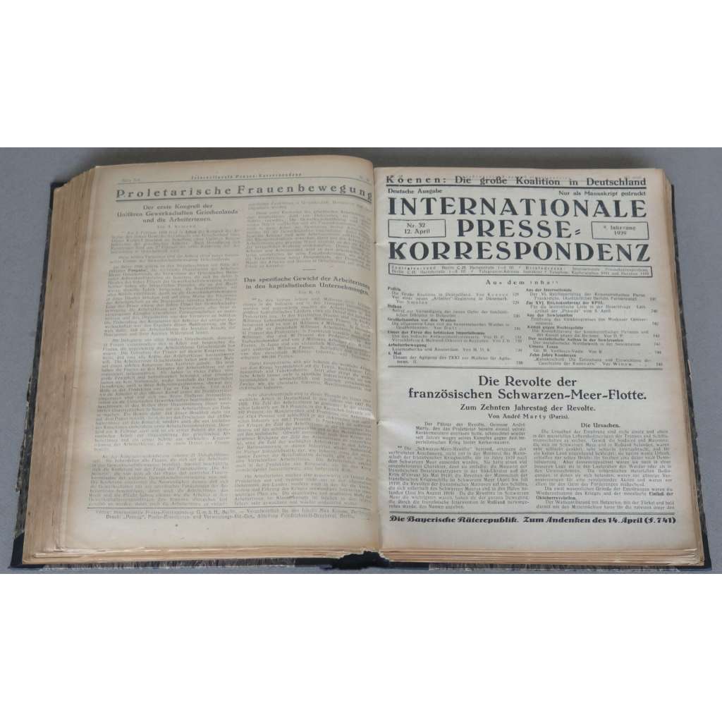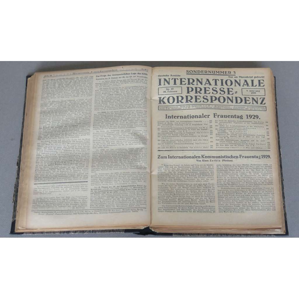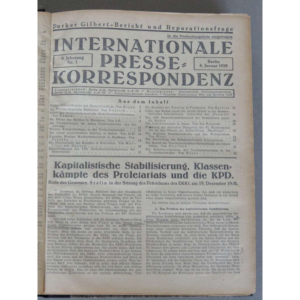 První polovina (Halbjahr) devátého ročníku mezinárodní tiskové služby Komunistické internacionály. Zahrnuje čísla od 4. 1. (č. 1) do 28. 6. 1929 (č. 56); doplněno rejstříky pro tuto první polovinu ročníku; chybí čísla 2, 24 a 45.