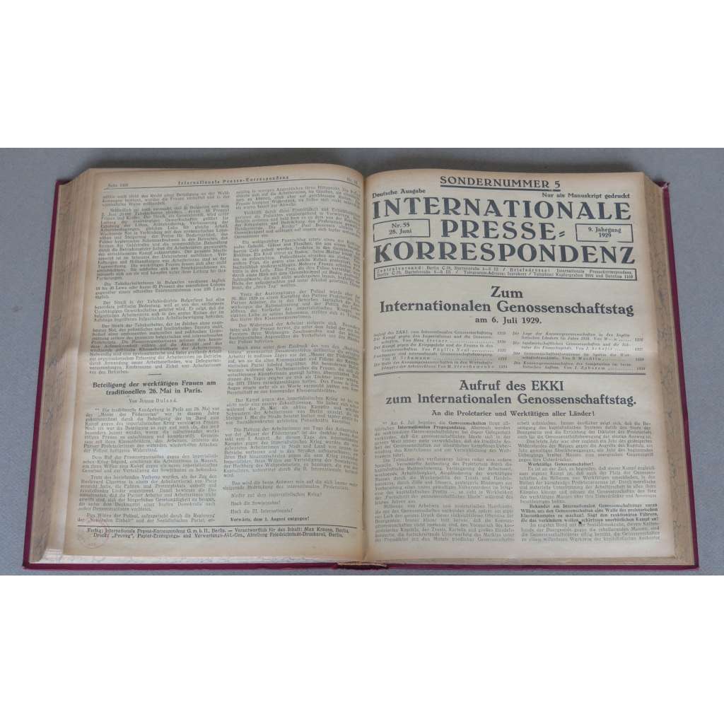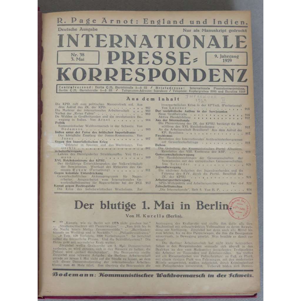 Druhá třetina devátého ročníku mezinárodní tiskové služby Komunistické internacionály. Zahrnuje čísla od 3. 5. (č. 38) do 30. 8. 1929 (č. 83); vevázán je rejstřík pro celou první polovinu (Halbjahr) ročníku; chybí deset čísel (41, 63, 65, 70-72, 74, 76, 78, 79).
