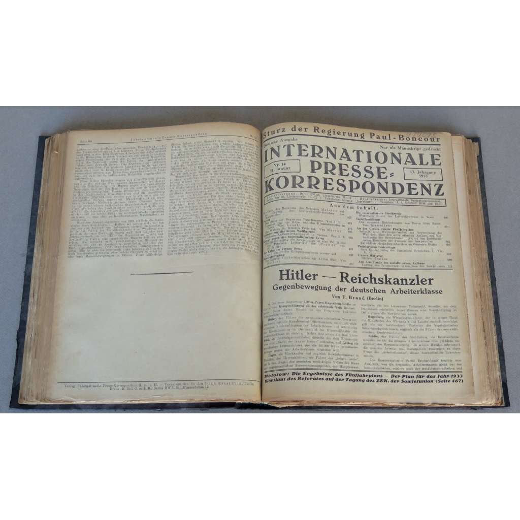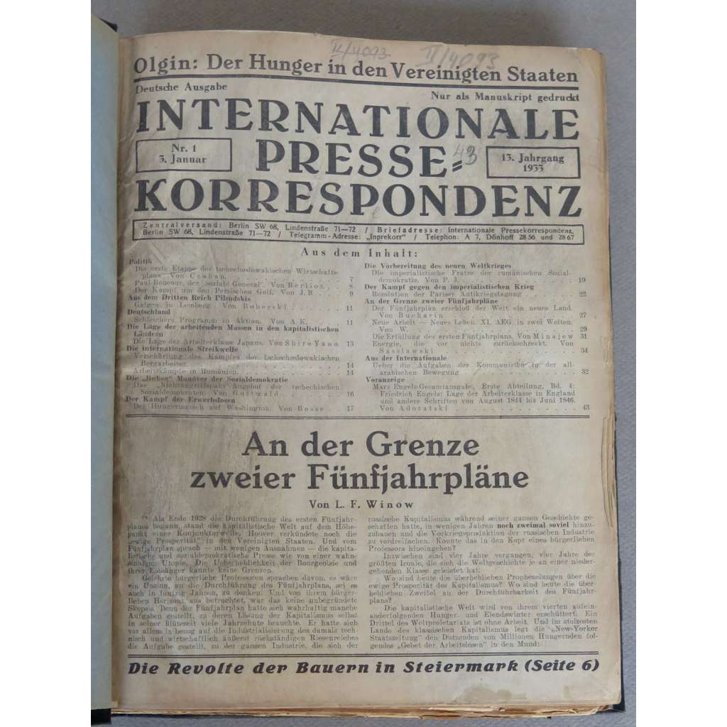 Všechna čísla třináctého ročníku mezinárodní tiskové služby Komunistické internacionály. Svazek zahrnuje čísla od 3. 1. (č. 1) do 3. 3. 1933 (č. 27); vzácné, velká část čísel vyšla po Hitlerově uchopení moci. Číslo 10 obsahuje celostránkovou hospodářskou mapu SSSR (druhý pětiletý plán).