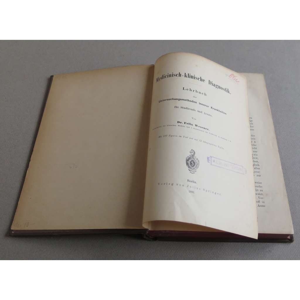 Vydání: Berlin: Verlag von Julius Springer 1892, celoplátěná vazba s titulem na přední desce a hřbetu, červená ořízka, XII+490 stran s ilustracemi a tabulemi, 4° (16,5 x 23,5 cm)