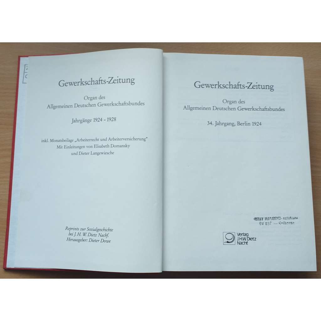 Reprint odborového časopisu, s obsahem a přílohou „Práva a pojištění pracovníků“ a úvod od D. Langewiescheho (O významu vzdělávací činnosti pro odbory ve Výmarské republice) a E. Domanské (Pracovní spory a pracovní právo ve Výmarské republice). Politika, legislativa, mezinárodní vztahy, odborové hnutí mládeže, kongresy, zprostředkování zaměstnání, vzdělávání, družstva