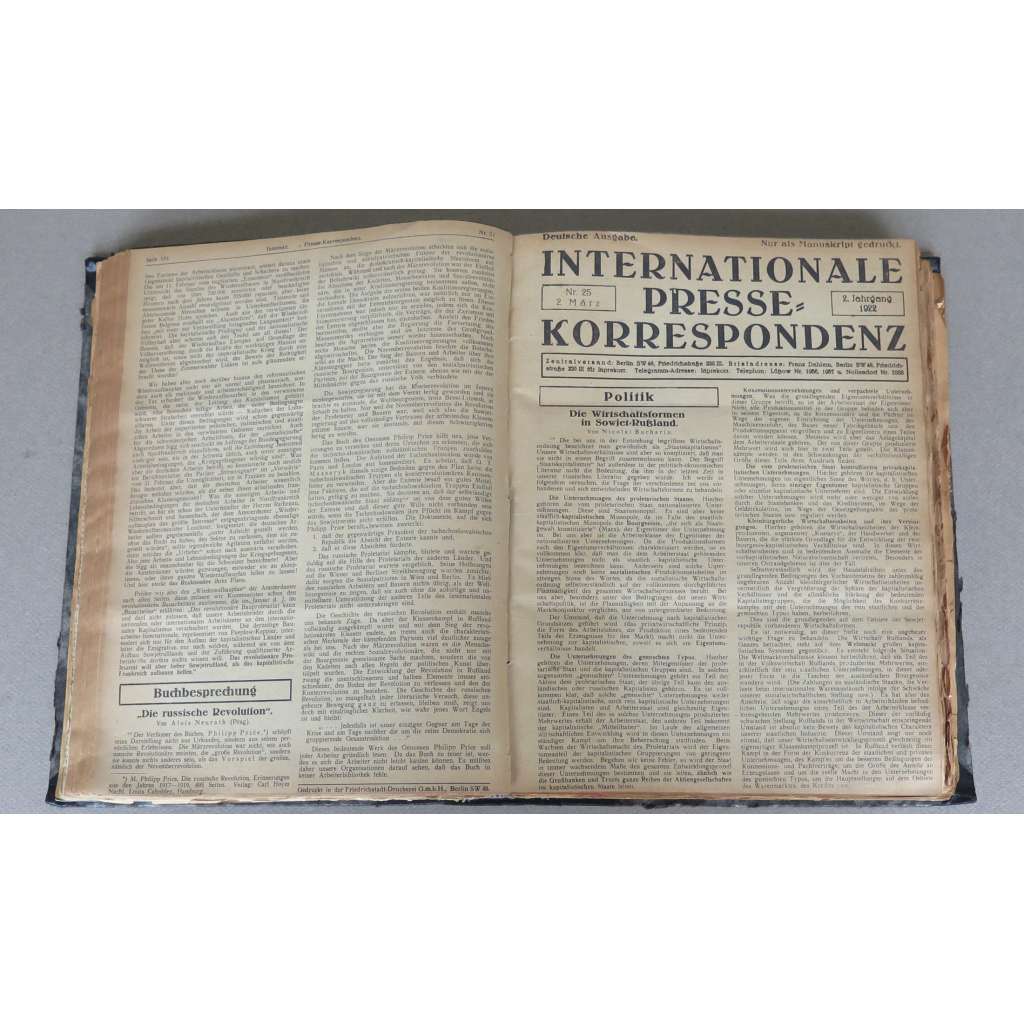 První polovina (Halbjahr) druhého ročníku mezinárodní tiskové služby Komunistické internacionály. Zahrnuje čísla od 3. 1. 1922 (č. 1) do 30. 6. 1922 (č. 124); doplněno rejstříky pro tuto první polovinu ročníku; chybí č. 70, 100 a 121.