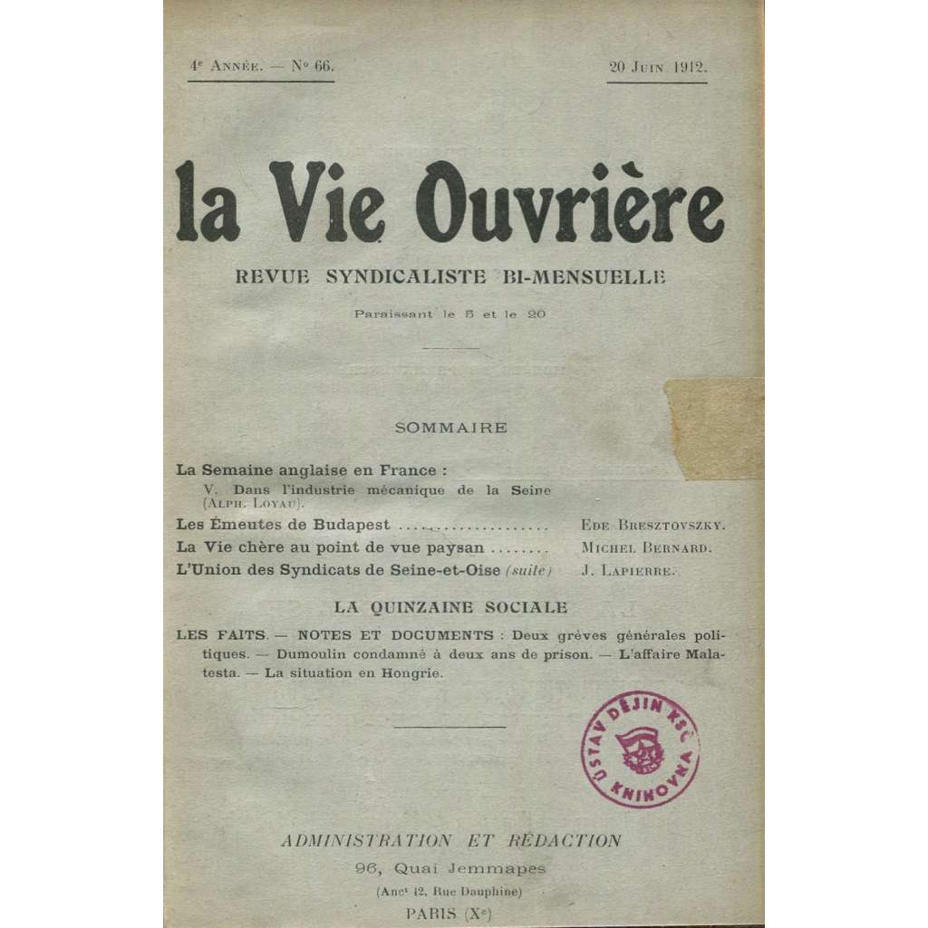 La Vie Ouvrière, roč. 4, 1912, č. 66-72 [revoluční syndikalismus; levicový časopis; dělnictvo; dělníci; odbory; Francie]