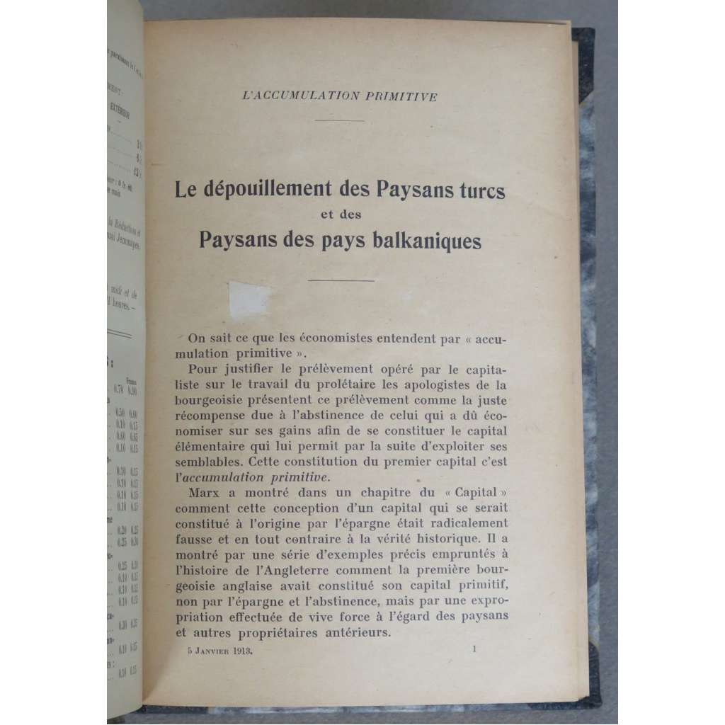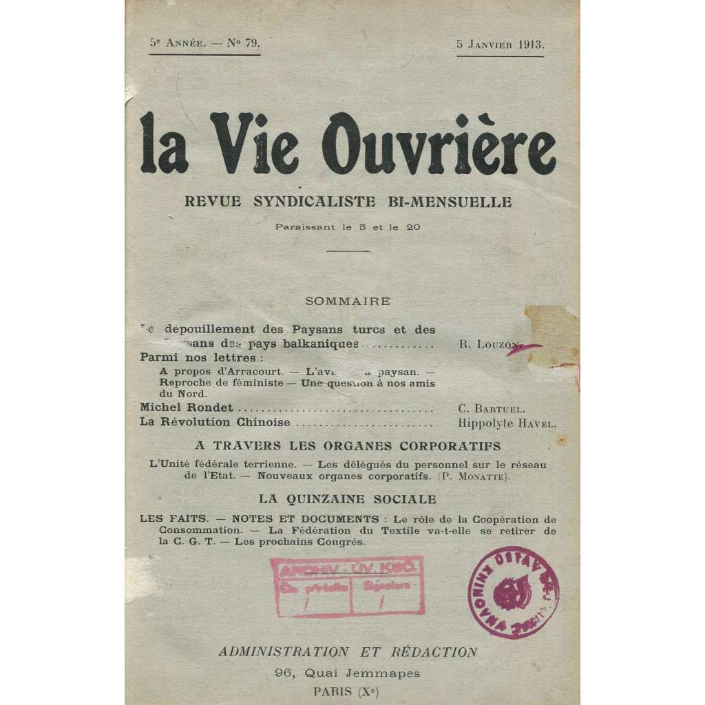 Část čísel 5. ročníku francouzského revolučně syndikalistického čtrnáctideníku; svazek obsahuje čísla 79-82 a 84 (časopis číslován průběžně), tj. od 5. 1. do 20. 3. 1913 (chybí č. 83 z 5. 3. 1913). Vevázána je pouze přední část obálky č. 79, další obálky chybí. Žádný obsah není vevázán.
