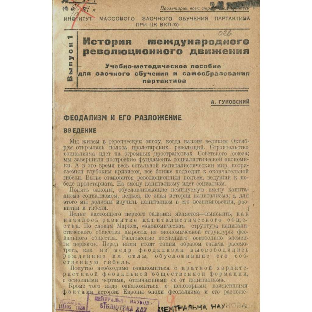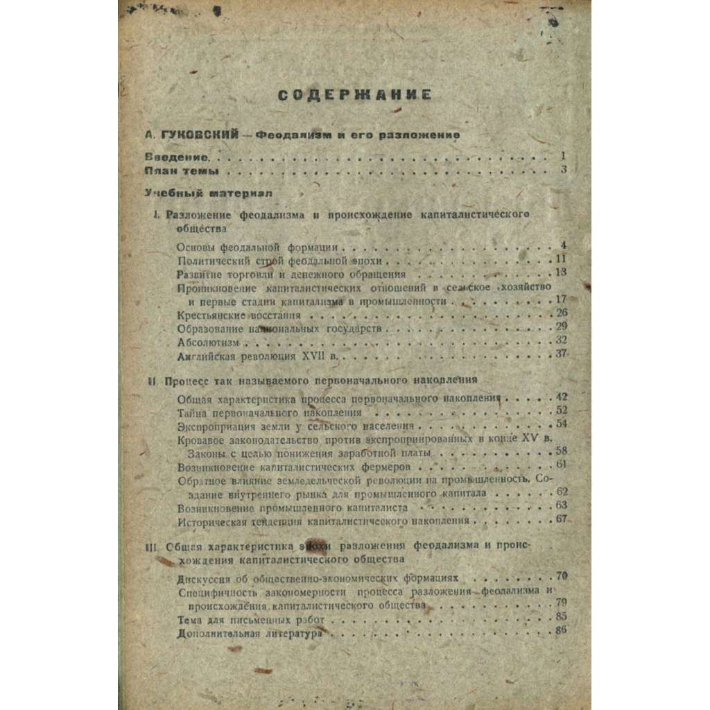 První sešit "Korespondenční komunistické univerzity" z roku 1932; edice byla určena pro dálkové vzdělávání stranických kádrů v Sovětském svazu; tento sešit obsahuje populární výklad krize feudalismu a vzniku kapitalismu od sovětského historika Alexeje Gukovského (1895–1969), později poměrně významné postavy sovětské historiografie. Viz naskenovaný obsah.