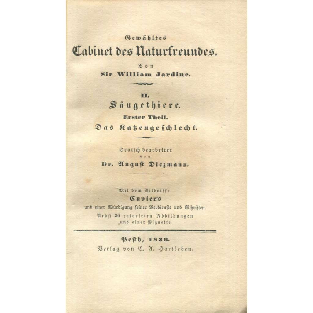 Německý překlad jednoho z mnoha svazků edice "The Naturalist's Library", kterou editoval a částečně napsal významný skotský přírodovědec William Jardine (1800–1874); tento svazek se zabývá kočkovitými šelmami, lvem počínaje a kanadským rysem konče; doplněno pojednáním o přírodovědci Cuvierovi. Přeložil August Diezmann.