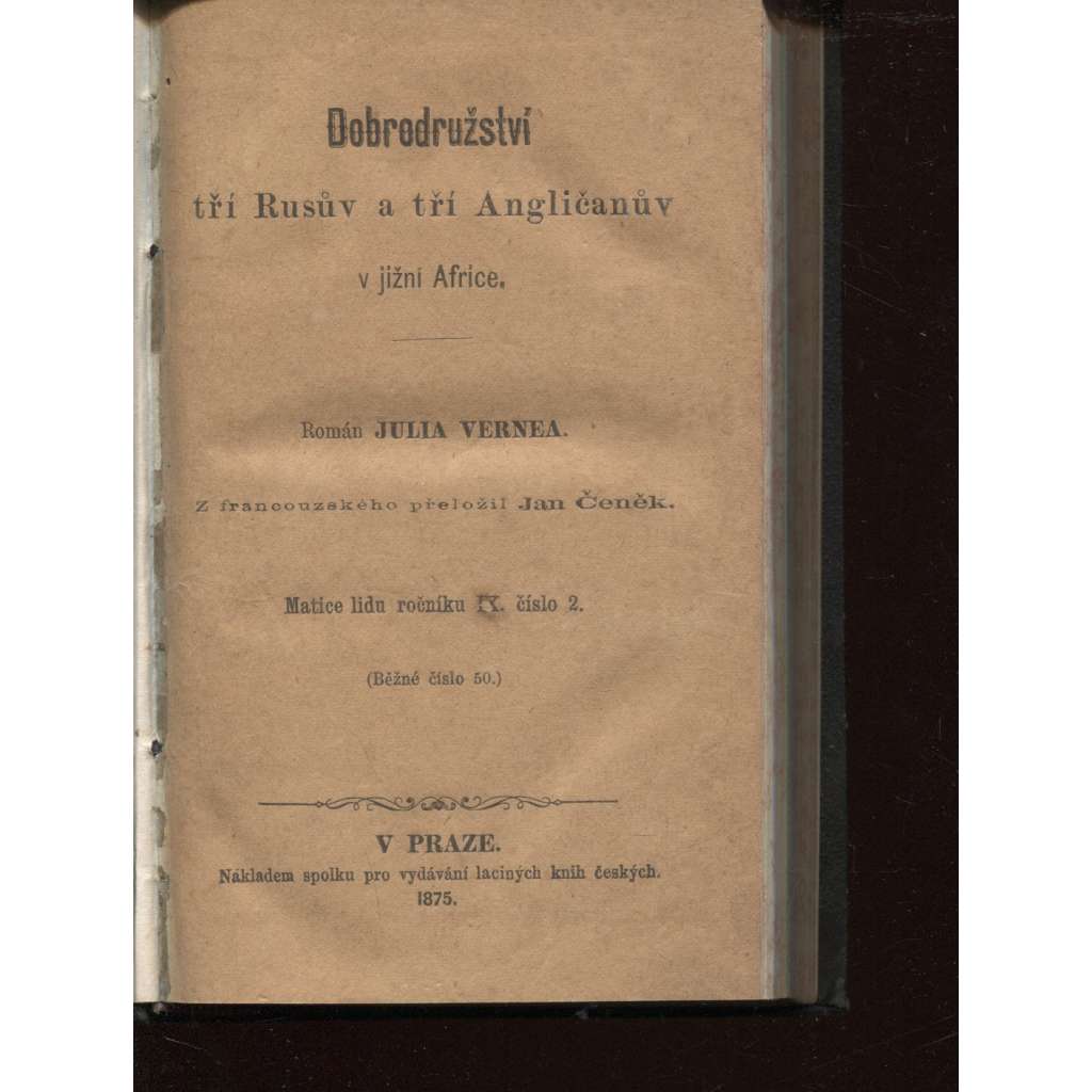 Dobrodružství tří Rusů a tří Angličanů v jižní Africe. Přeložil Jan Čeněk. Nákladem spolku pro vydávání laciných knih českých, Praha 1875. Stran 160.