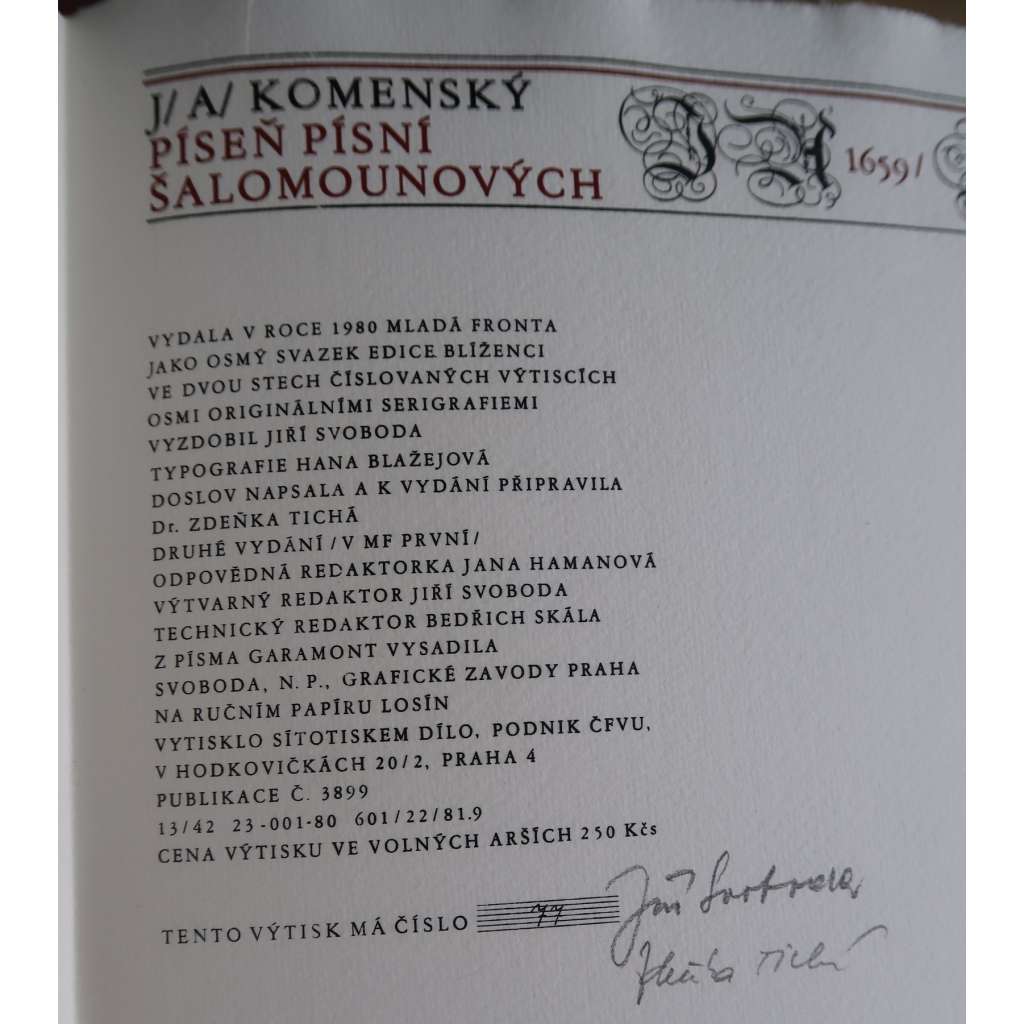Velkoformátové bibliofilské vydání.  Přebásnění Písně písní od J.A. Komenského, určené pro jeho Kancionál z roku 1659. S doslovem Z. Tiché.