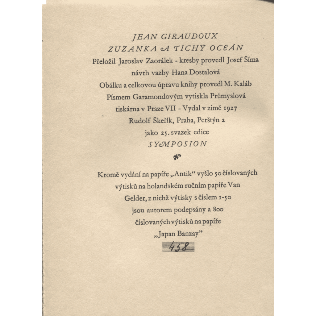 Vydání: Rudolf Škeřík, Praha 1927 jako 25. svazek edice Symposion. Přeložil J. Zaorálek, původní celoplátěná vazba, rozměry: 15 x 19,5 cm, 203 stran.