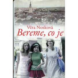 V románu nazvaném Bereme, co je předkládá autorka Věra Nosková sugestivní generační výpověď, která je i výjimečně přesnou analýzou komunistického režimu. S bravurou a neobyčejně čtivě popsala generaci, jíž předcházeli Škvoreckého Zbabělci a na niž navázala éra Vieweghových Báječných let pod psa. Hrdinka příběhu dospívá v šedesátých letech na maloměstě a jako většina mladých lidí touží po lásce, svobodě a uplatnění. Rodina, v níž vyrůstá, i neprodyšný krunýř místní partajní vrchnosti jí ovšem brzy dají jasně najevo, že není na ní, aby o sobě rozhodovala – že od toho jsou tu jiní… Autorka s brilantním humorem nemilosrdně charakterizuje ona léta naděje a zklamání. Život v upatlané diktatuře však nabízí jen náhražky a malé lidské tragikomedie, které Nosková pozoruje plnokrevným ženským pohledem a popisuje s ironickým odstupem. Autentičnost a syrovost této prózy, jejímž leitmotivem je hledání ztraceného otce, ohromí. Román Bereme, co je patří ke knihám, které se čtou doslova jedním dechem.