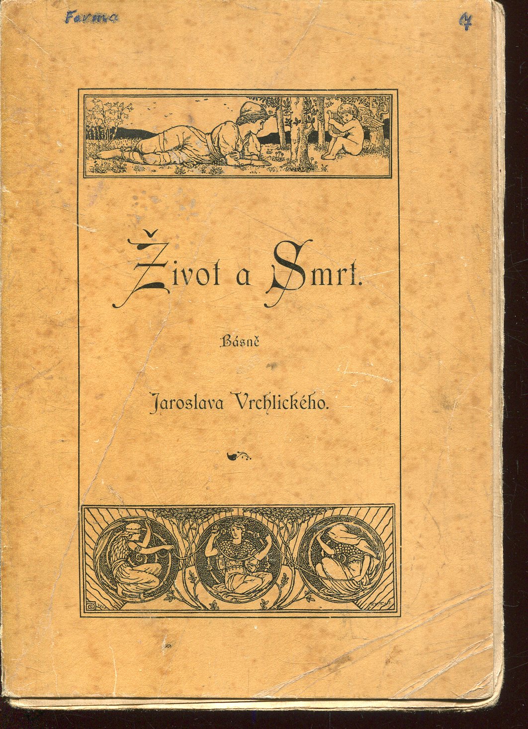 Dobrý stav, spodní roh obálky je přehnutý, knižní blok je uvolněný z obálky, knižní blok rozvolněný. Věnování a podpis Jaroslav Vrchlický