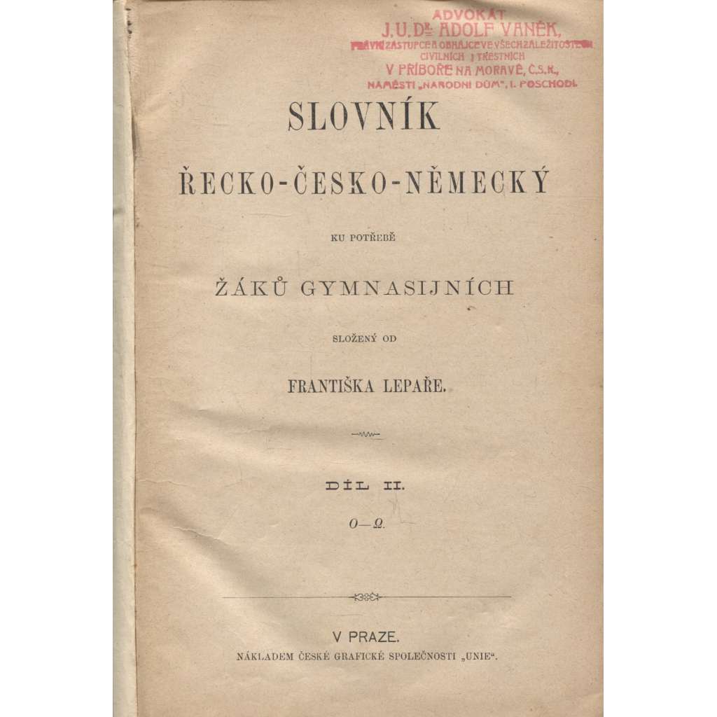Slovník řecko-česko-německý ku potřebě žáků gymnasijních. Komplet dvou svazků.