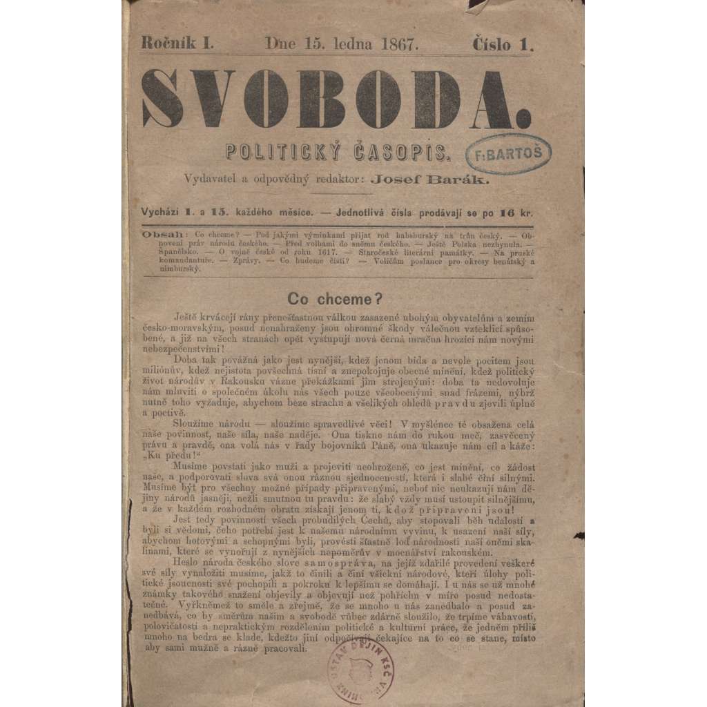 Svoboda. Politický časopis. Ročník I./1867 (levicová literatura)