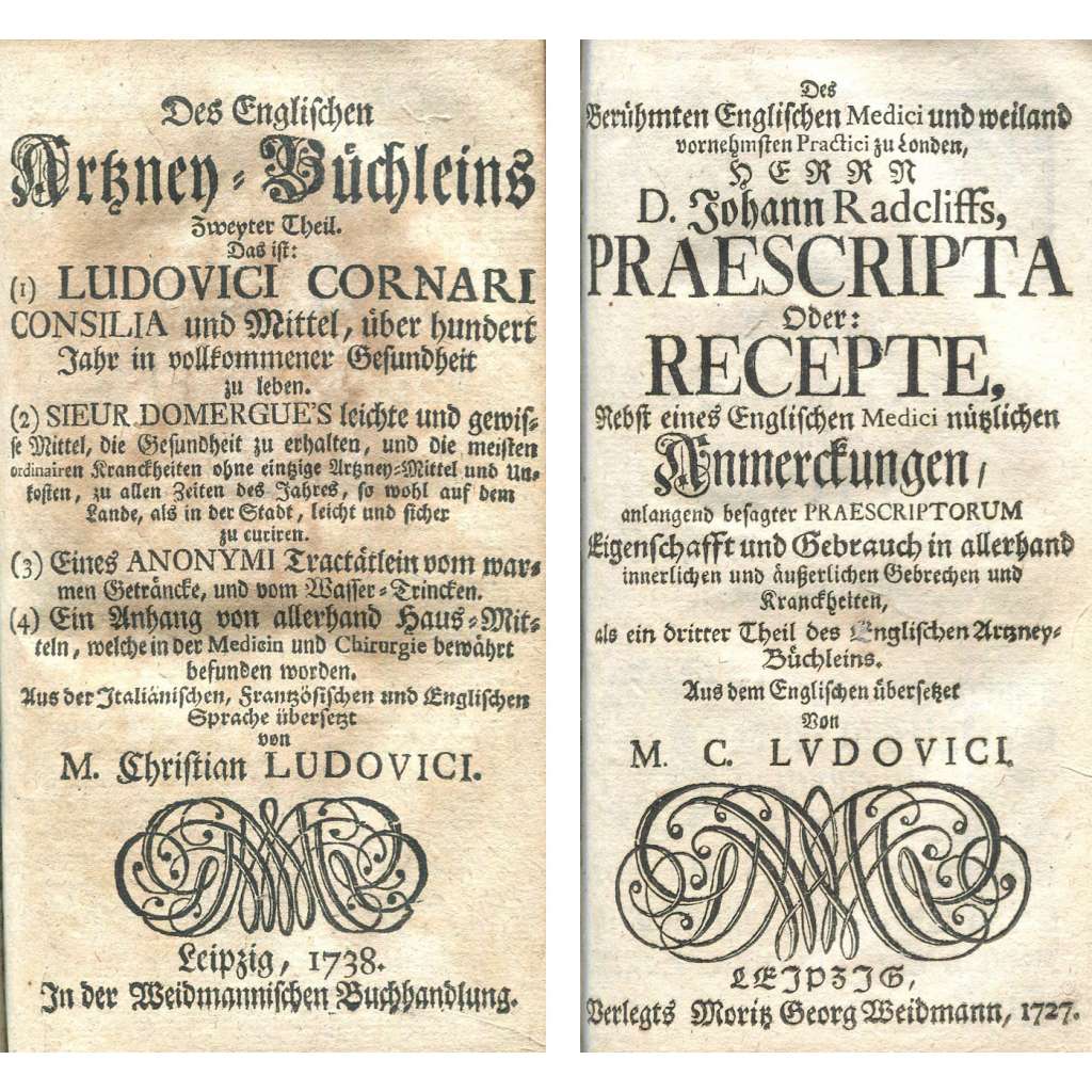 Třídílný soubor lékařských pojednání, receptů a rad od vícero autorů; nejznámější jsou Richard Lower (zemř. 1691; autor prvního dílu), Luigi Cornaro (zemř. 1566) a John Radcliffe (zemř. 1714; autor třetího dílu); přeloženo z angličtiny a dalších jazyků do němčiny; díly/svazky jsou svázány do jednoho fyzického svazku; všechny díly jsou z pozdějších vydání, v případě prvního dílu ze sedmého. Kompletní výtisky.