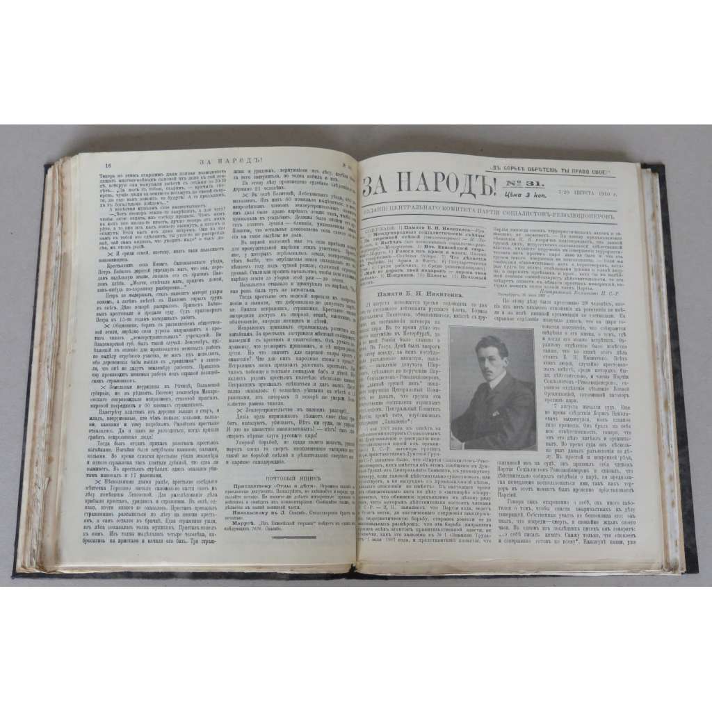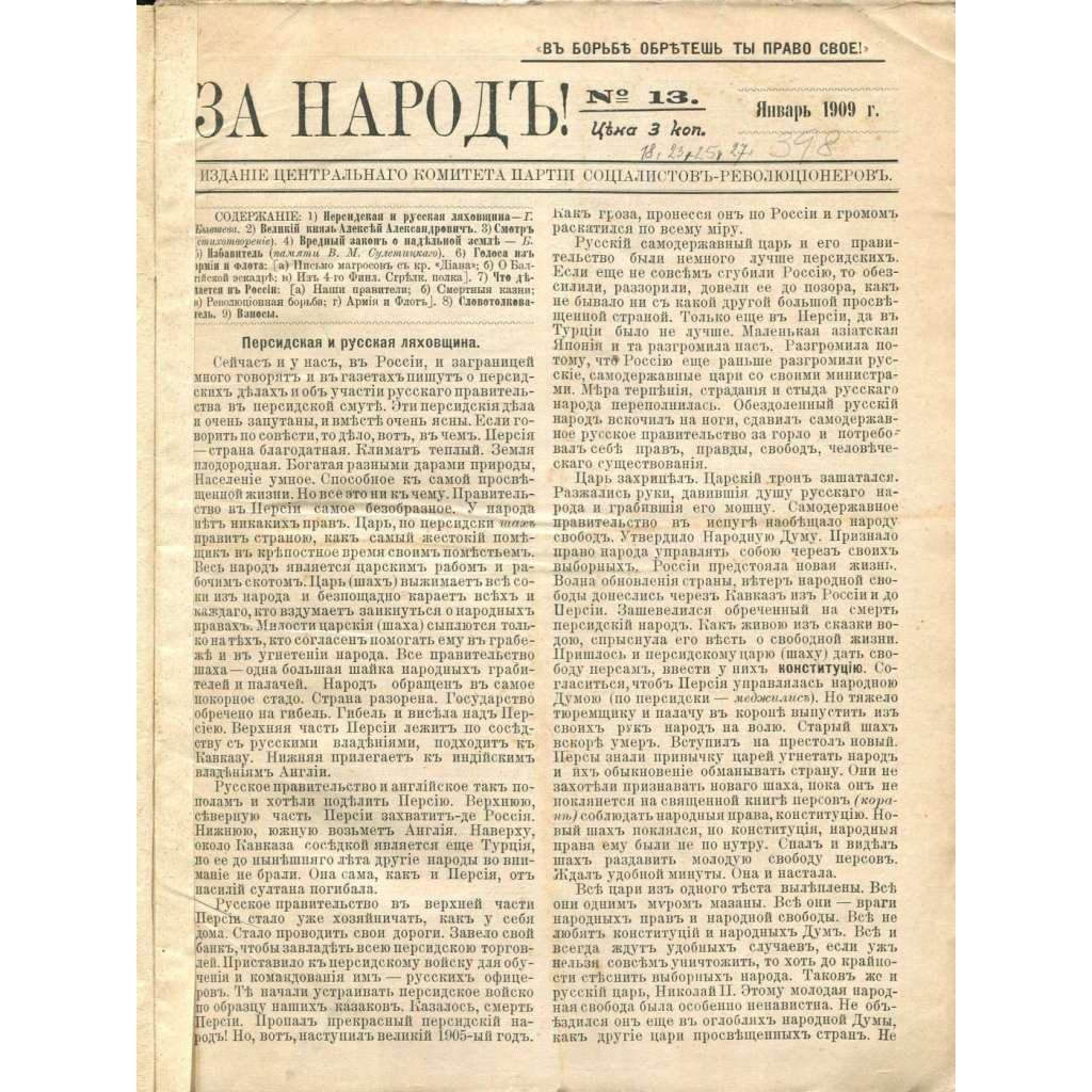 Svazek vzácných exilových čísel časopisu "Za Narod!" vydávaného ruskou Stranou socialistů revolucionářů ("eserů"); svázána jsou čísla od ledna 1909 (č. 13) do května 1914 (č. 60). Chybí č. 18, 23, 25 a 27. Časopis byl zpočátku vydáván jednou měsíčně, později nepravidelně, obvykle každé dva měsíce; číslován byl průběžně. V pozdějších číslech jsou občasné ilustrace (fotografie, karikatury).