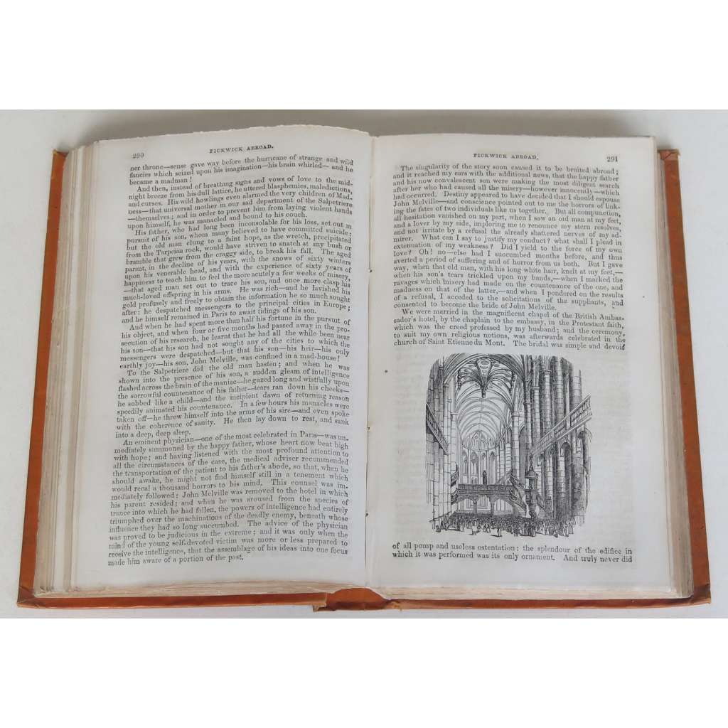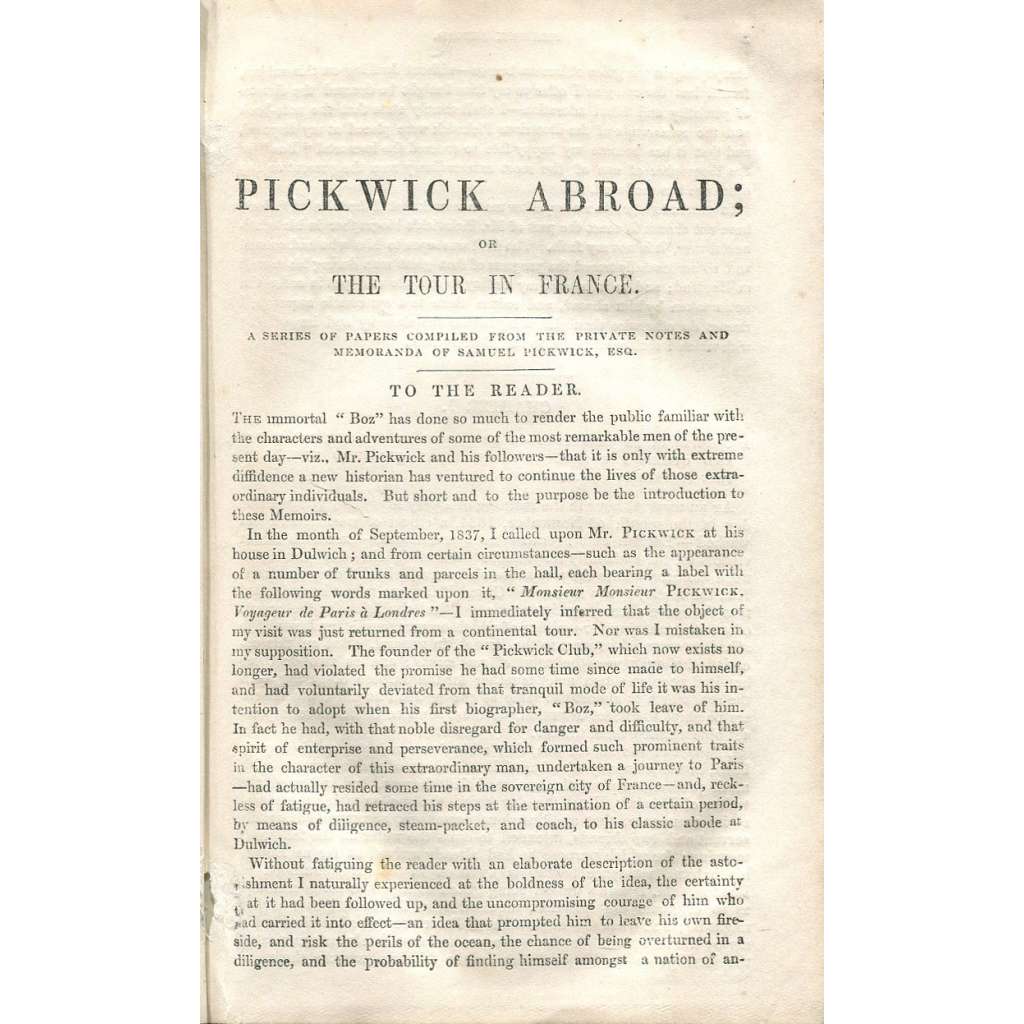Román "Pickwick Abroad; or, The Tour in France" od George W. M. Reynoldse (1814-1879), jednoho z nejpopulárnějších spisovatelů viktoriánské Anglie; postavou Samuela Pickwicka navázal autor na Dickense. Román poprvé vyšel časopisecky v letech 1837 a 1838 (knižně poprvé 1839). Ilustrováno xylografiemi.