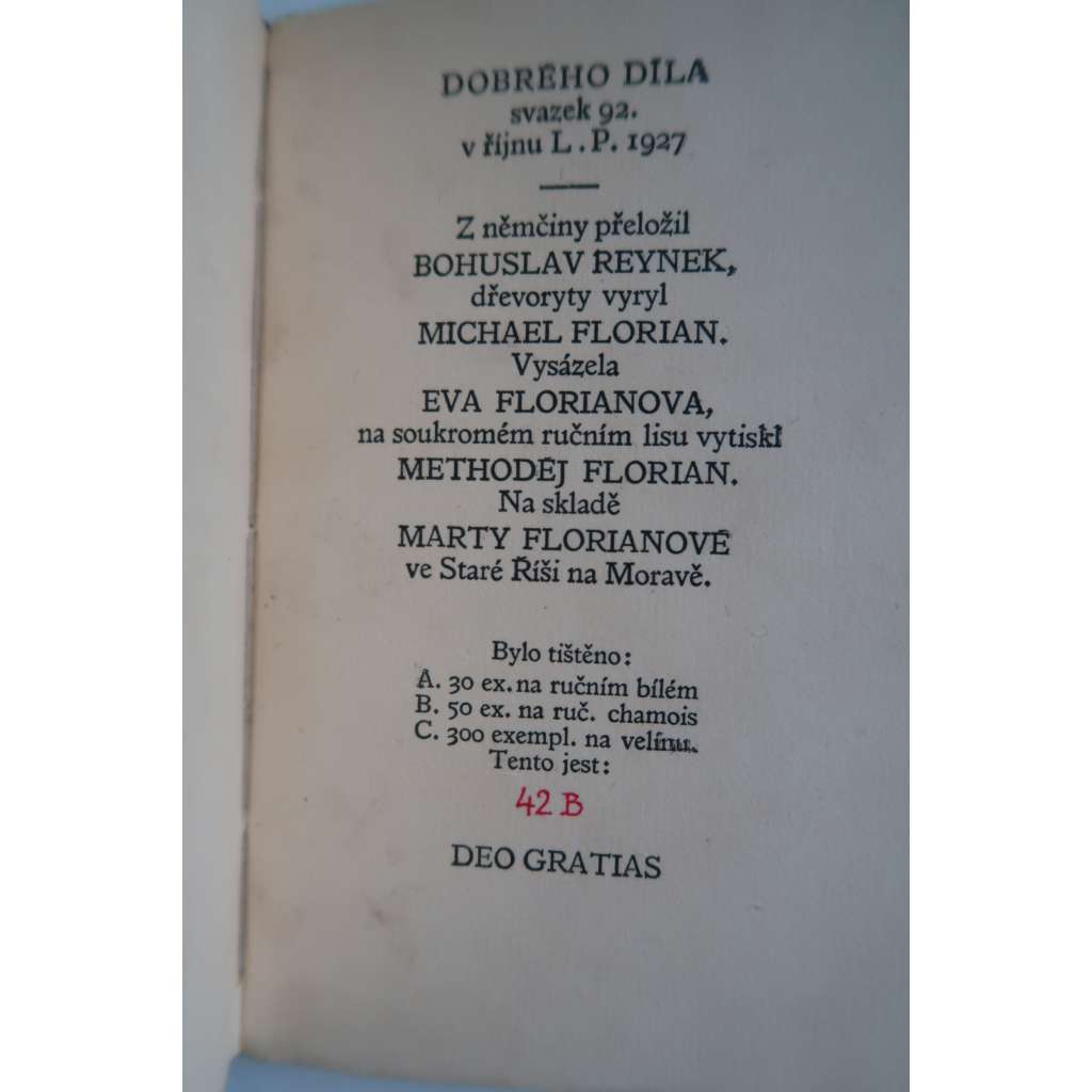 Číslovaný výtisk 42 B na papíře chamois (jeden z padesáti). Vydala Marta Florianová, Stará Říše 1927.
