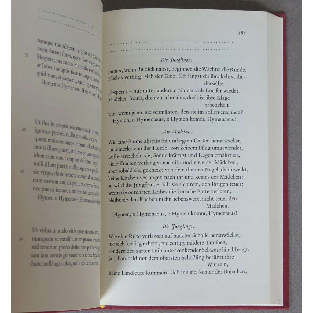 Sebrané Catullovy básně v původní latině a zrcadlovém německém překladu Otto Weinreicha; ten napsal i 90stránkovou úvodní studii.