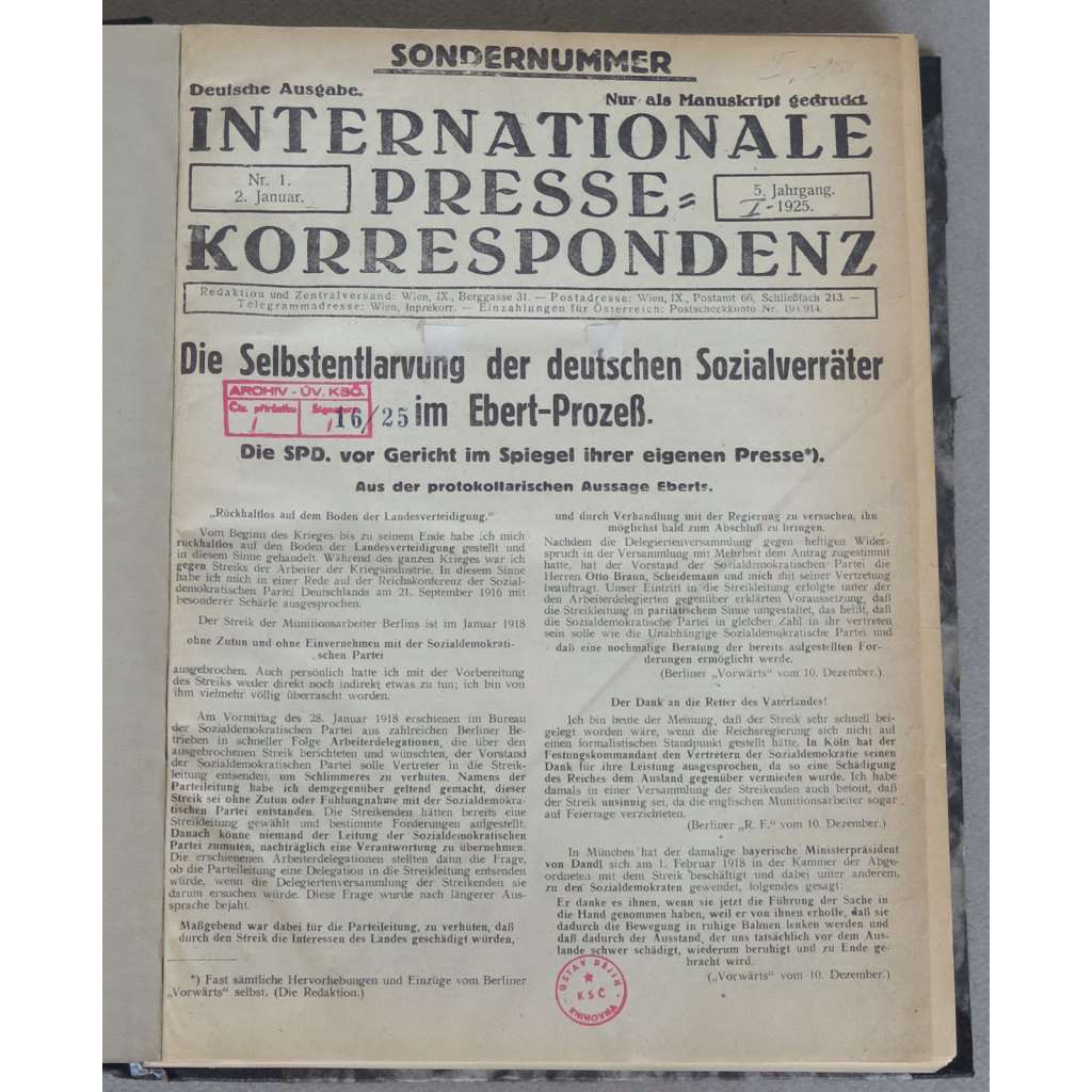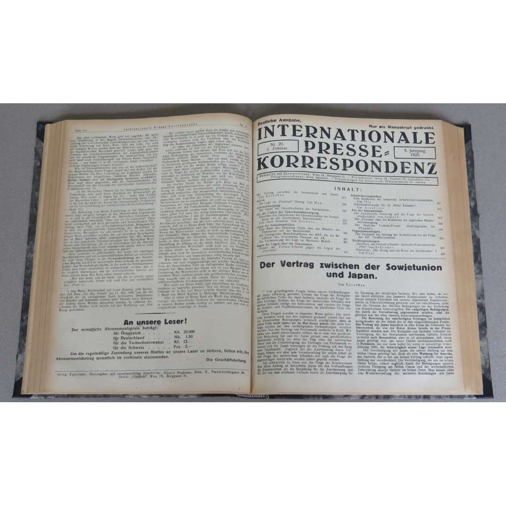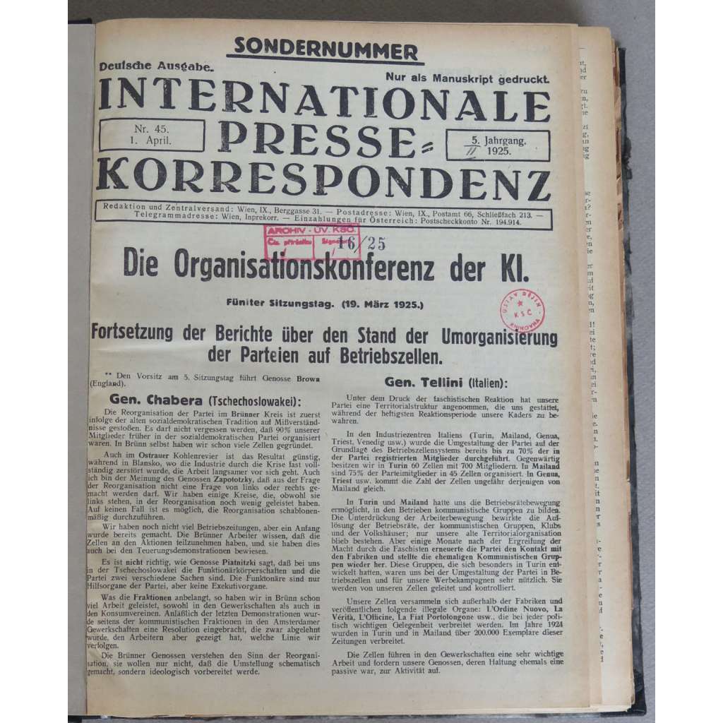 První polovina (Halbjahr) pátého ročníku mezinárodní tiskové služby Komunistické internacionály. Zahrnuje čísla od 2. 1. (č. 1) do 30. 6. 1925 (č. 102); chybí rejstříky pro tuto první polovinu ročníku; žádné číslo nechybí. Svázáno do dvou fyzických svazků.