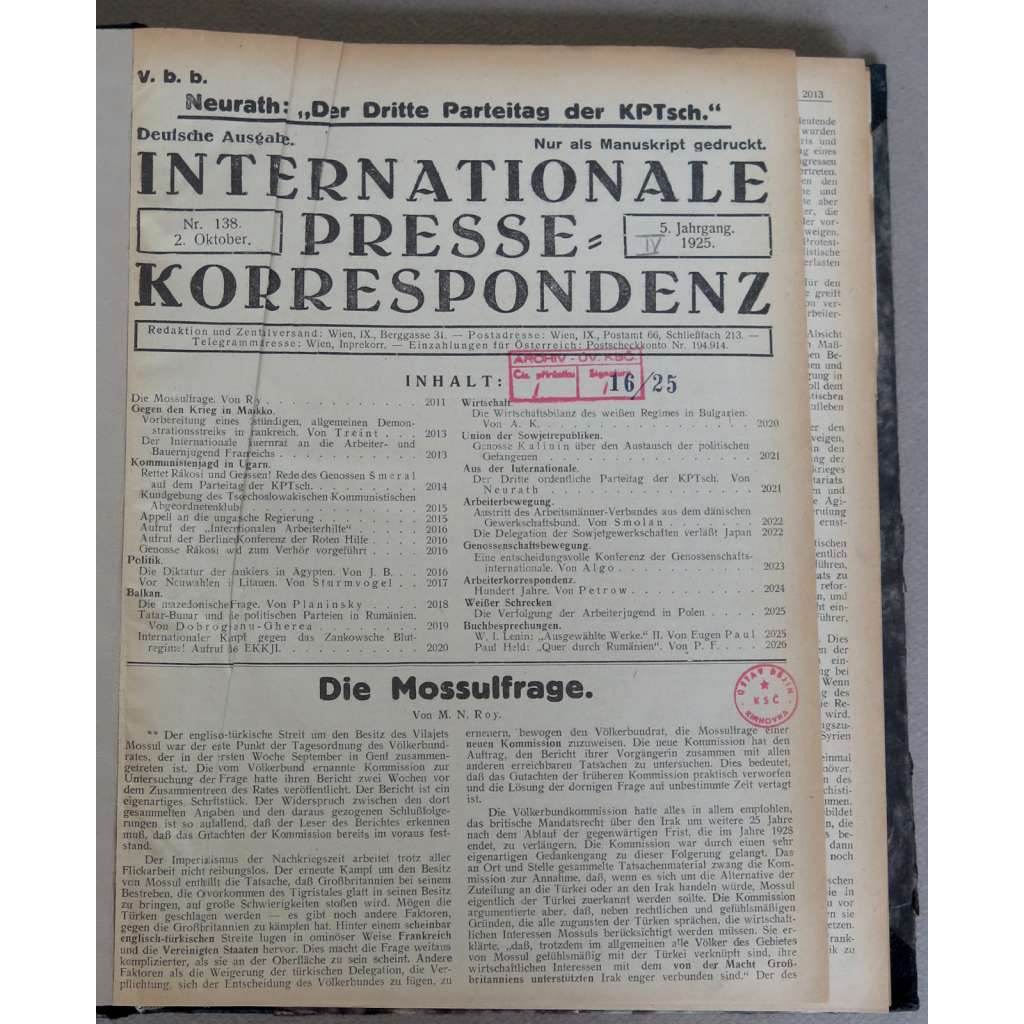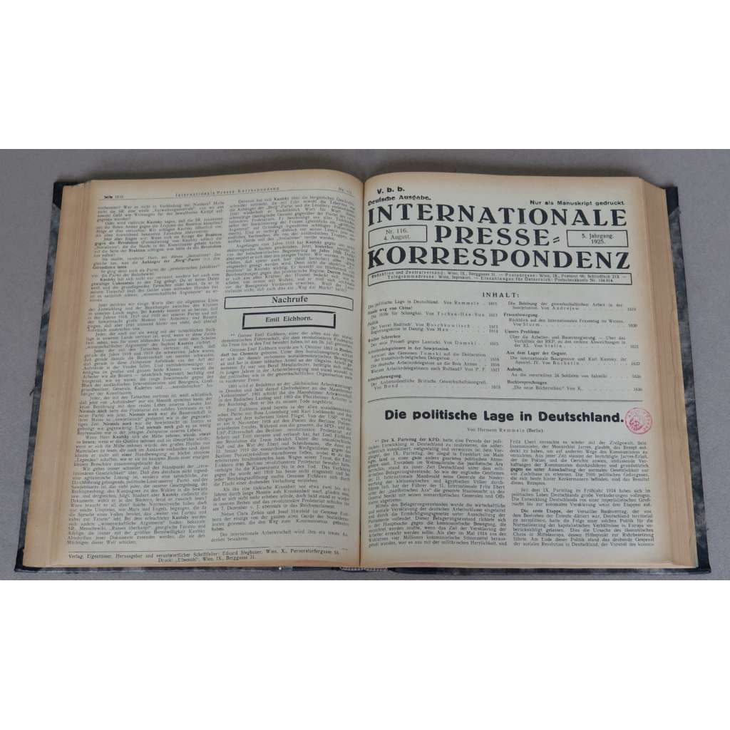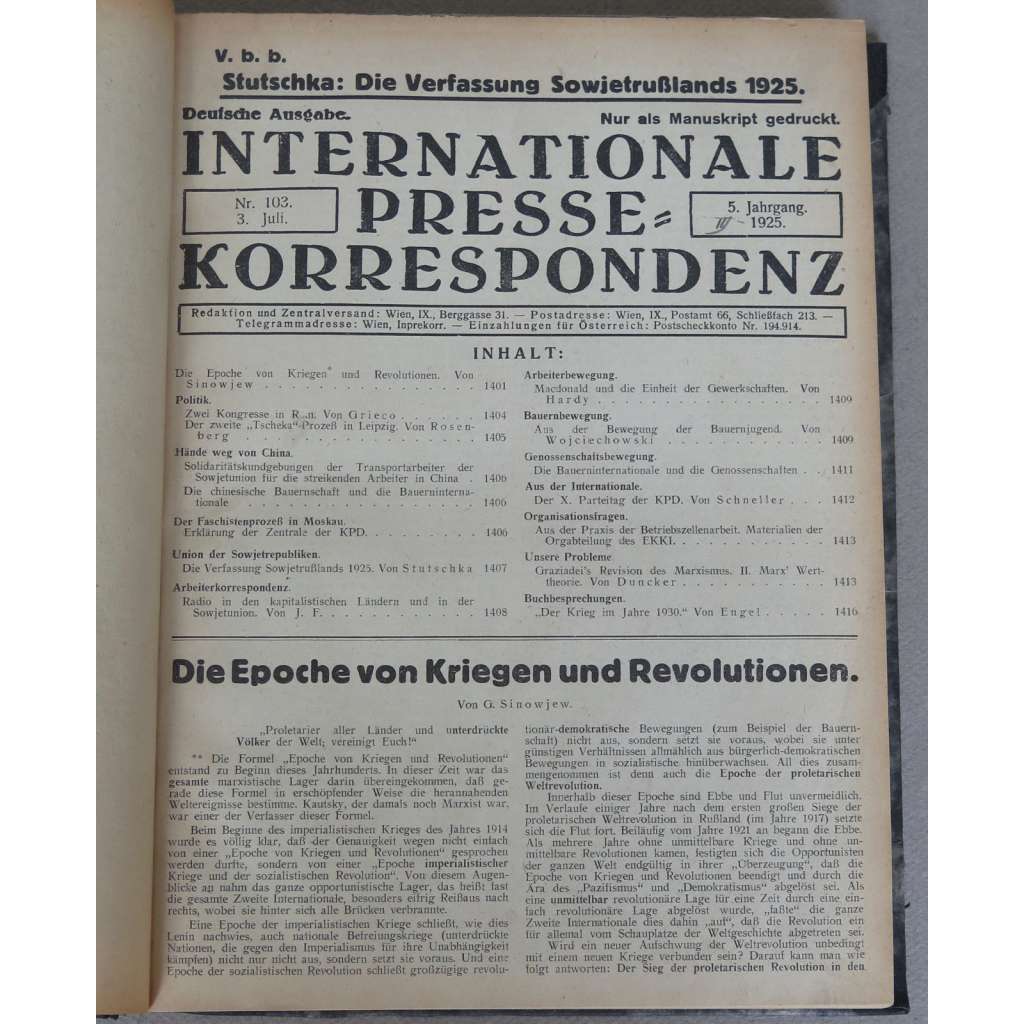 Druhá polovina (Halbjahr) pátého ročníku mezinárodní tiskové služby Komunistické internacionály. Zahrnuje čísla od 3. 7. (č. 103) do 31. 12. 1925 (č. 172); doplněno rejstříky pro tuto druhou polovinu ročníku; žádné číslo nechybí. Svázáno do dvou fyzických svazků.