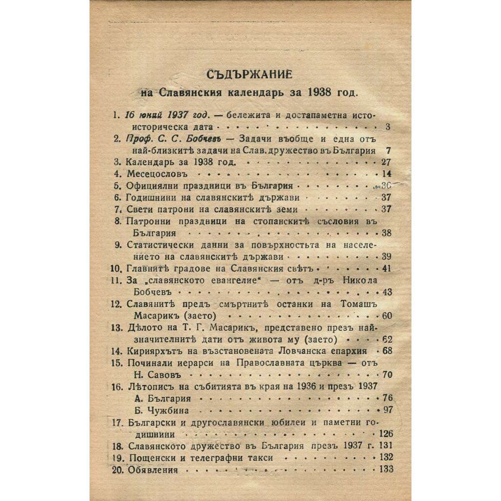 Kalendář pro rok 1938 vydaný Slovanským sdružením v Bulharsku (Славянско дружество въ България), celkem jde o 28. ročník; v podstatě jde o ročenku tohoto sdružení, která obsahuje mj. nekrolog a krátký životopis T. G. Masaryka. Viz dále naskenovaný obsah.