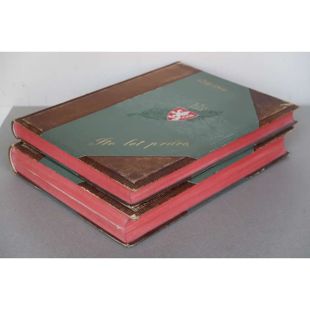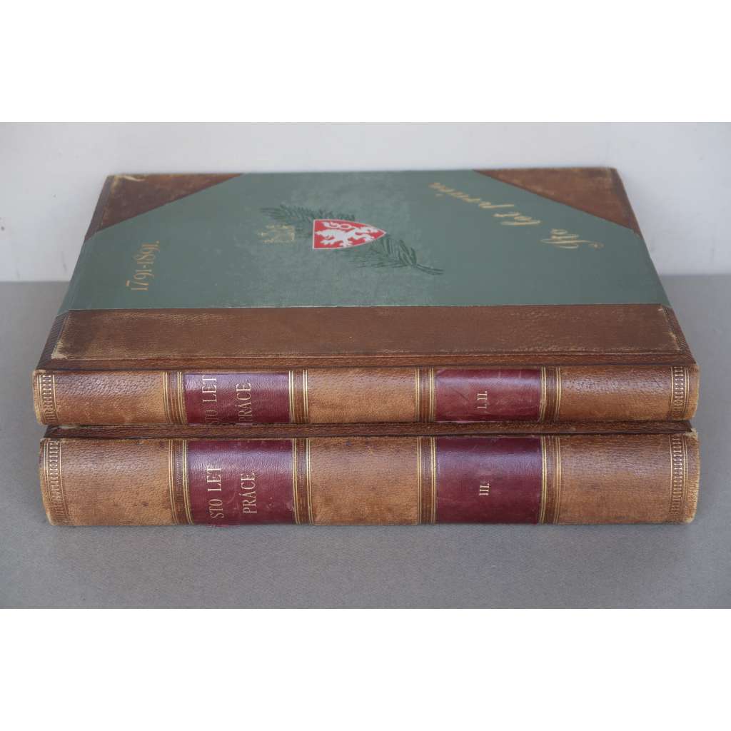 STO LET PRÁCE -DVA OBŘÍ SVAZKY- VŠEOBECNÁ VÝSTAVA 1891 - KRÁSNÁ SECESNÍ VAZBA - KŮŽE (KOMPLET)